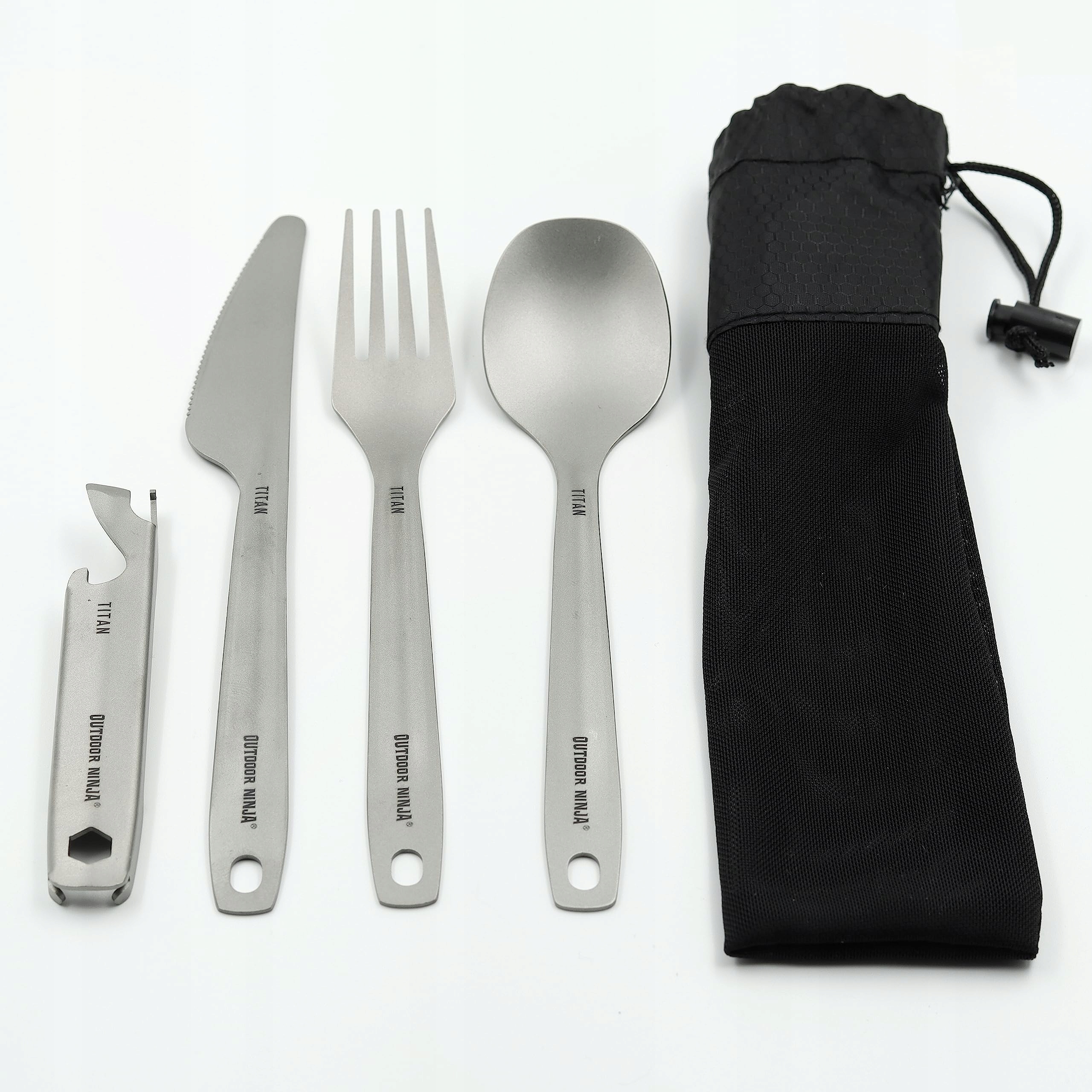 Outdoor Ninja Titan Zestaw Sztućców – ultralekki zestaw sztućców kempingowych z nożem, widelcem, łyżką, otwieraczem do butelek i puszek wraz z oddychającym woreczkiem siateczkowym do szybkiego suszenia