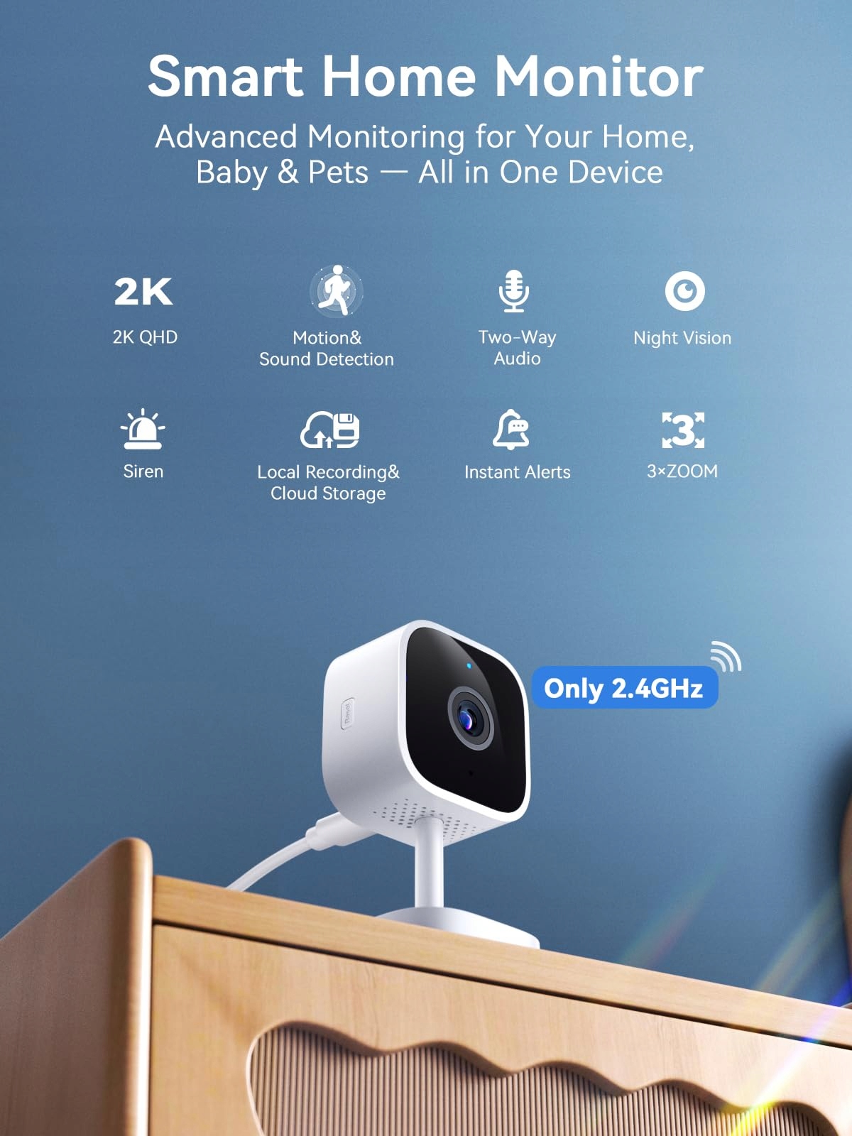 【Rozdzielczość 2K QHD + 3x zoom + IR-nocne widzenie】Kamera do monitoringu wewnętrznego PC300 posiada obiektyw 2K, który zapewnia szczegółową jakość obrazu i wyraźnie pokazuje nawet najmniejsze ruchy zwierząt domowych lub niemowląt. Dzięki 3-krotnemu cyfrowemu zoomowi możesz wyraźnie skupić się na ważnych obszarach. Wyposażona w podczerwone nocne widzenie, kamera oferuje wyraźny obraz nawet w całkowitej ciemności. Całodobowy podgląd – dom i zwierzęta pod kontrolą.