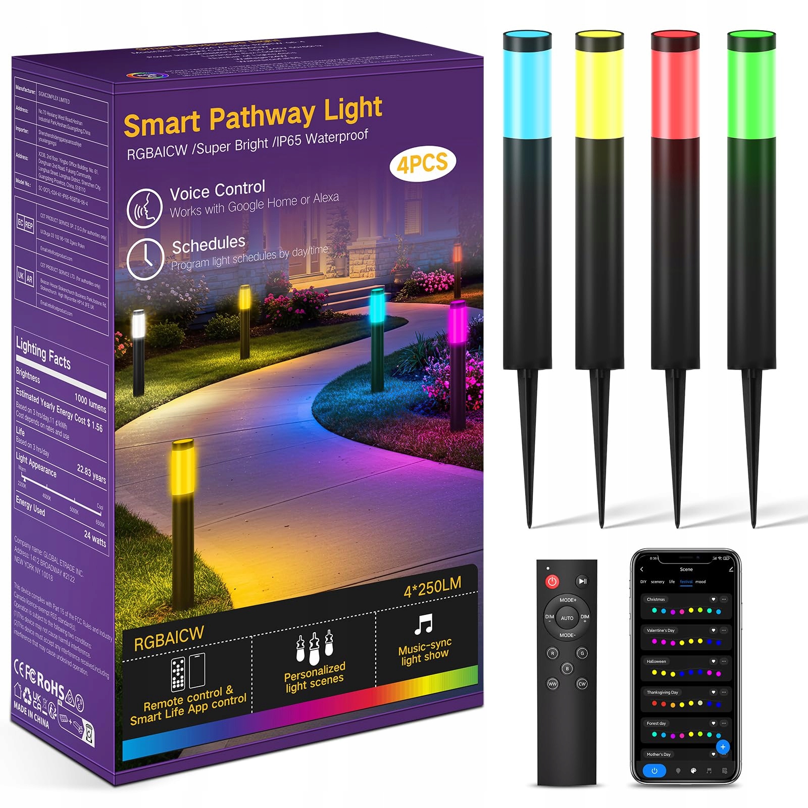 OUTON 4 sztuki RGBAICW lampy ścieżkowe na zewnątrz z pilotem i sterowaniem przez aplikację, wodoodporne IP65, działają z Alexa Google Assistant, ciepła biel, 24W lampa słupkowa do podwórek, ogrodów, trawników, 50cm