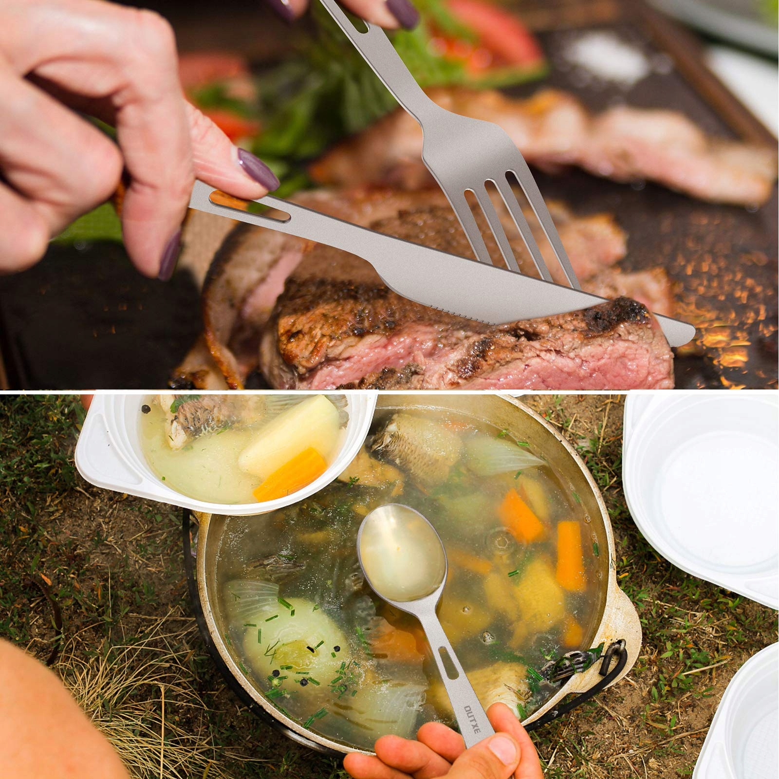 Zestaw sztućców z tytanu: Pomaga efektywnie jeść wszelkiego rodzaju jedzenie. Nóż i widelec mogą być używane do jedzenia steku, a łyżka do zup