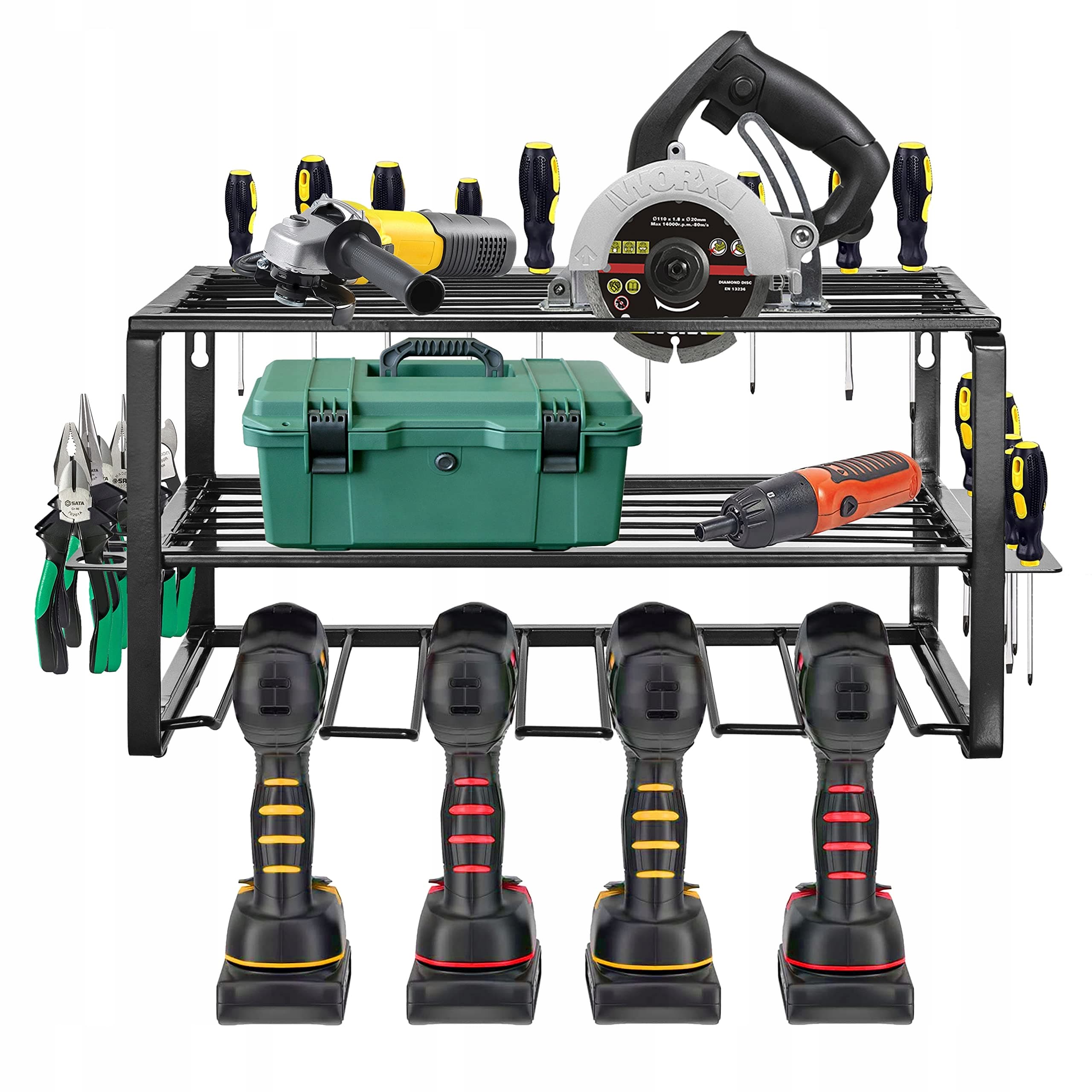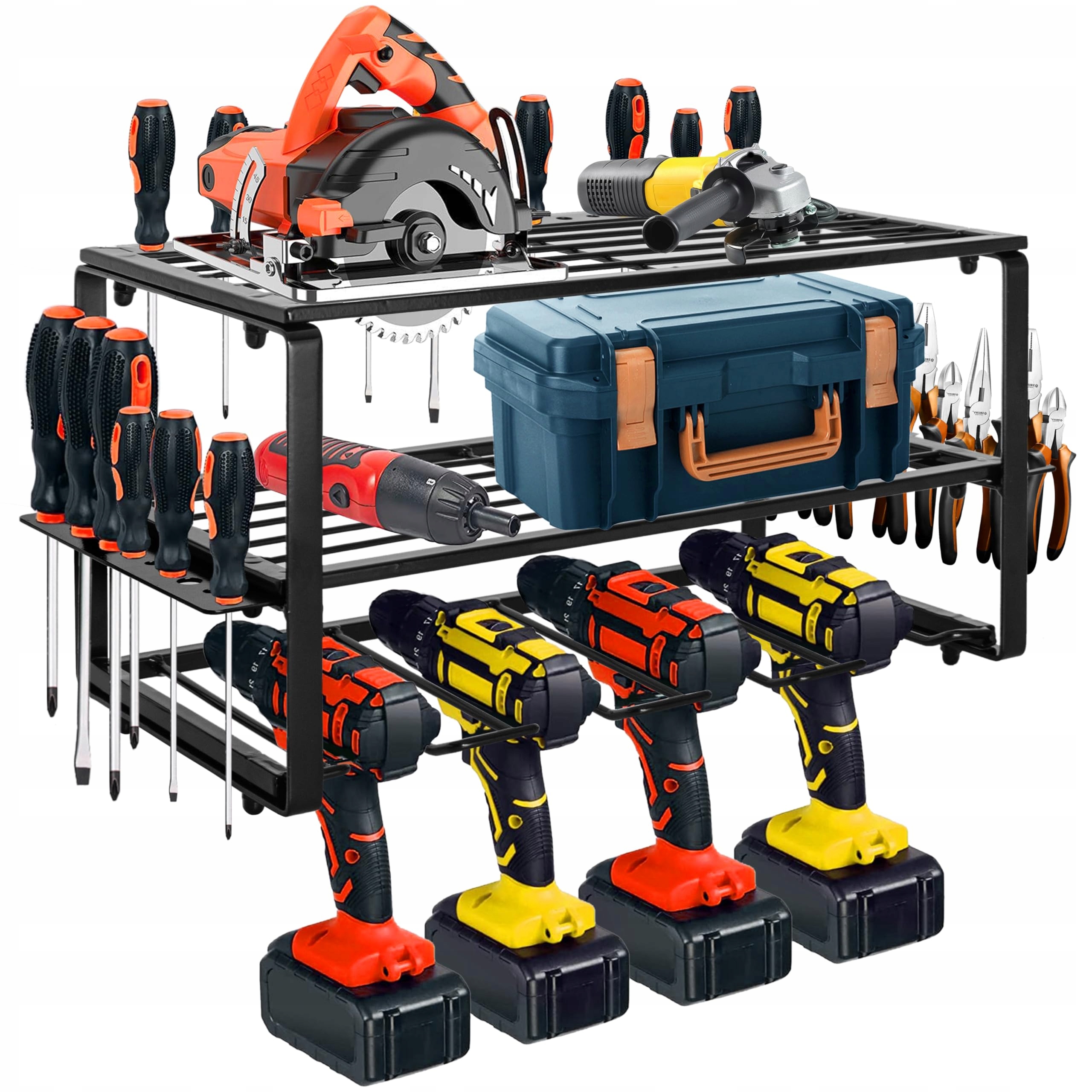 💎 Na pierwszym i drugim poziomie można umieścić śrubokręty, miarki, szlifierki, nożyce ręczne, szczypce i inne drobne elementy.