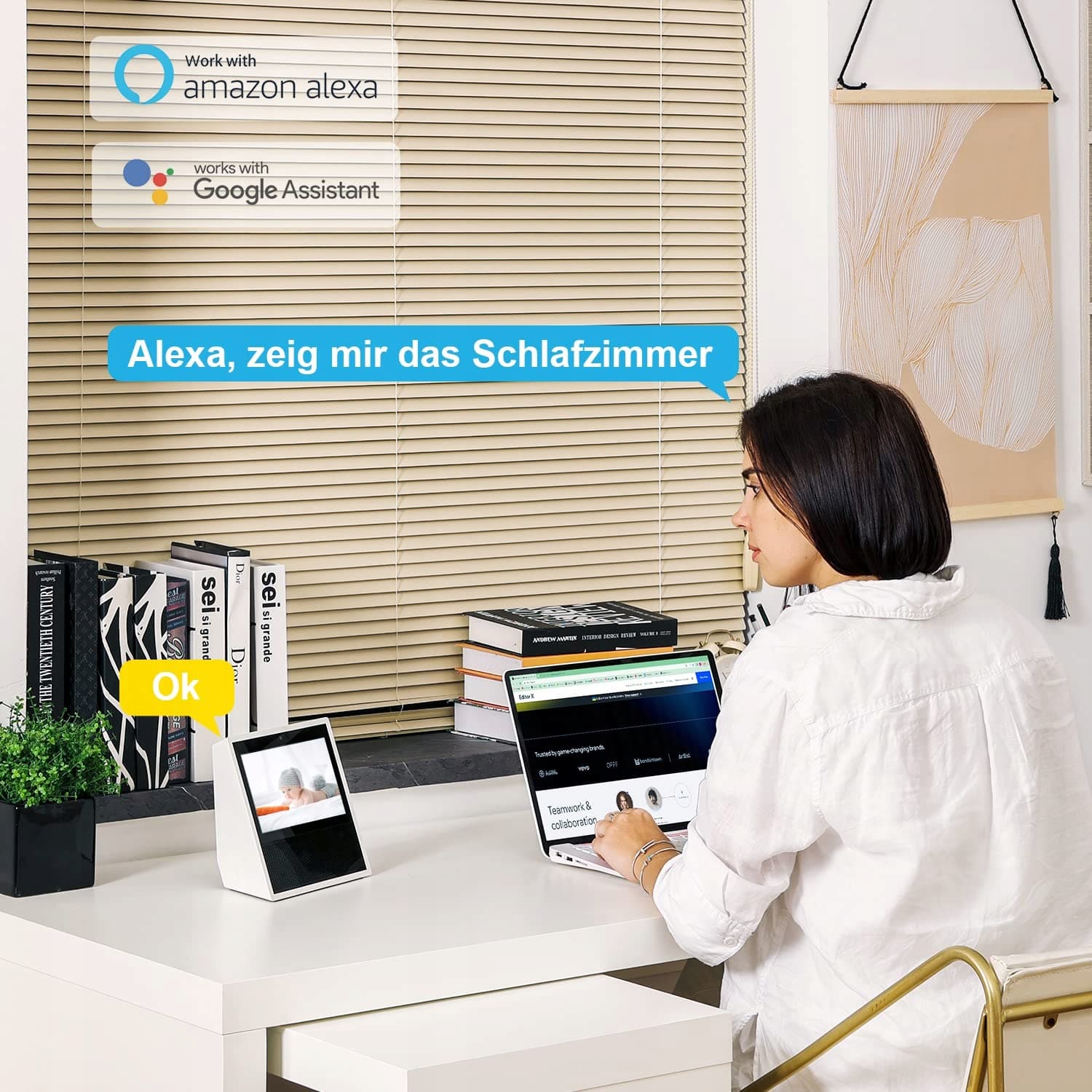 【Kompatybilna z Alexa & Asystentem Google】Kamera niania do bezpieczeństwa domowego jest w pełni kompatybilna z Alexa i Asystentem Google, po prostu powiedz do Alexa, aby włączyć kamerę w pokoju dziecka, wyraźnie zobacz na żywo obraz dziecka. Przełączaj się między różnymi urządzeniami kamerowymi za pomocą głosu, doświadcz inteligentnego domu.