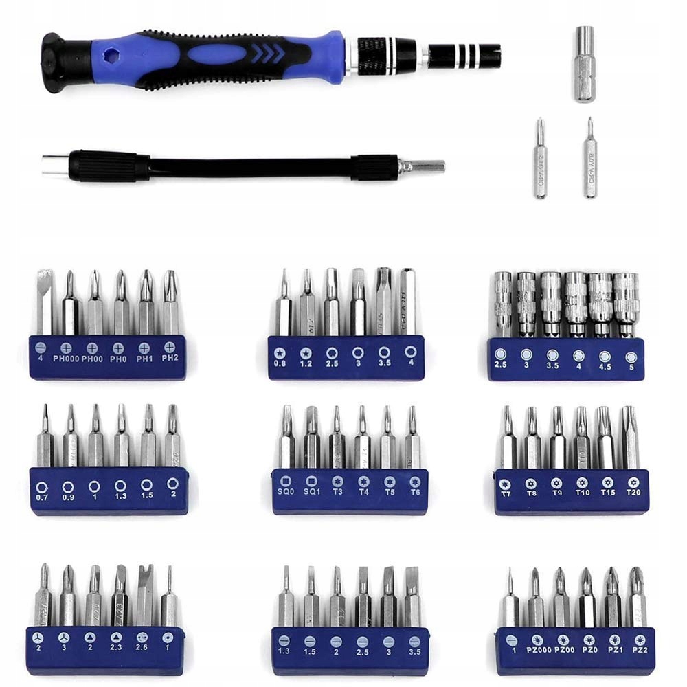 1) Zestaw narzędzi wielofunkcyjnych: Zestaw wkrętaków 79 w 1 zawiera 56 różnych rodzajów bitów, narzędzie do magnesowania i demagnesowania, pasek na nadgarstek antystatyczny, pęsety antystatyczne, spudgery, plectrum, nóż uniwersalny i inne narzędzia. Spudgery są naostrzone z jednej strony i łatwo wchodzą w szczeliny, co ułatwia otwieranie kabli i innych komponentów. Trójkątne plectra są używane do otwierania ekranów. Skrobak służy do ochrony folii ekranowej. Okrągłe i krzyżowe spudgery są zaprojektowane na zasadzie dźwigni, co oszczędza pracę.
