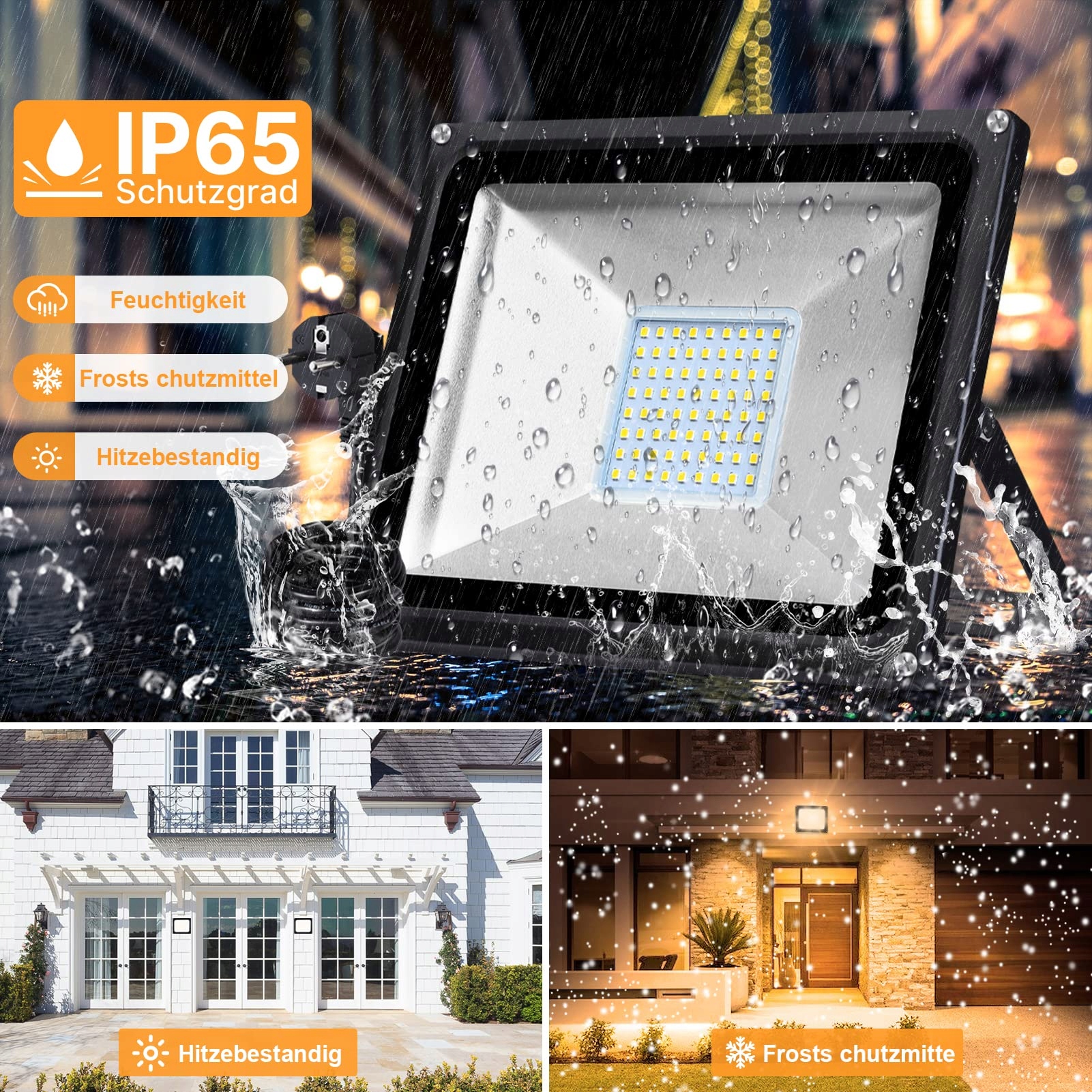 [IP65 wodoodporny]Ten reflektor wykonany jest z aluminiowej obudowy i hartowanego szkła. Z klasą ochrony IP65 reflektor może być normalnie używany w różnych trudnych warunkach pogodowych, takich jak deszcz, śnieg i burze.