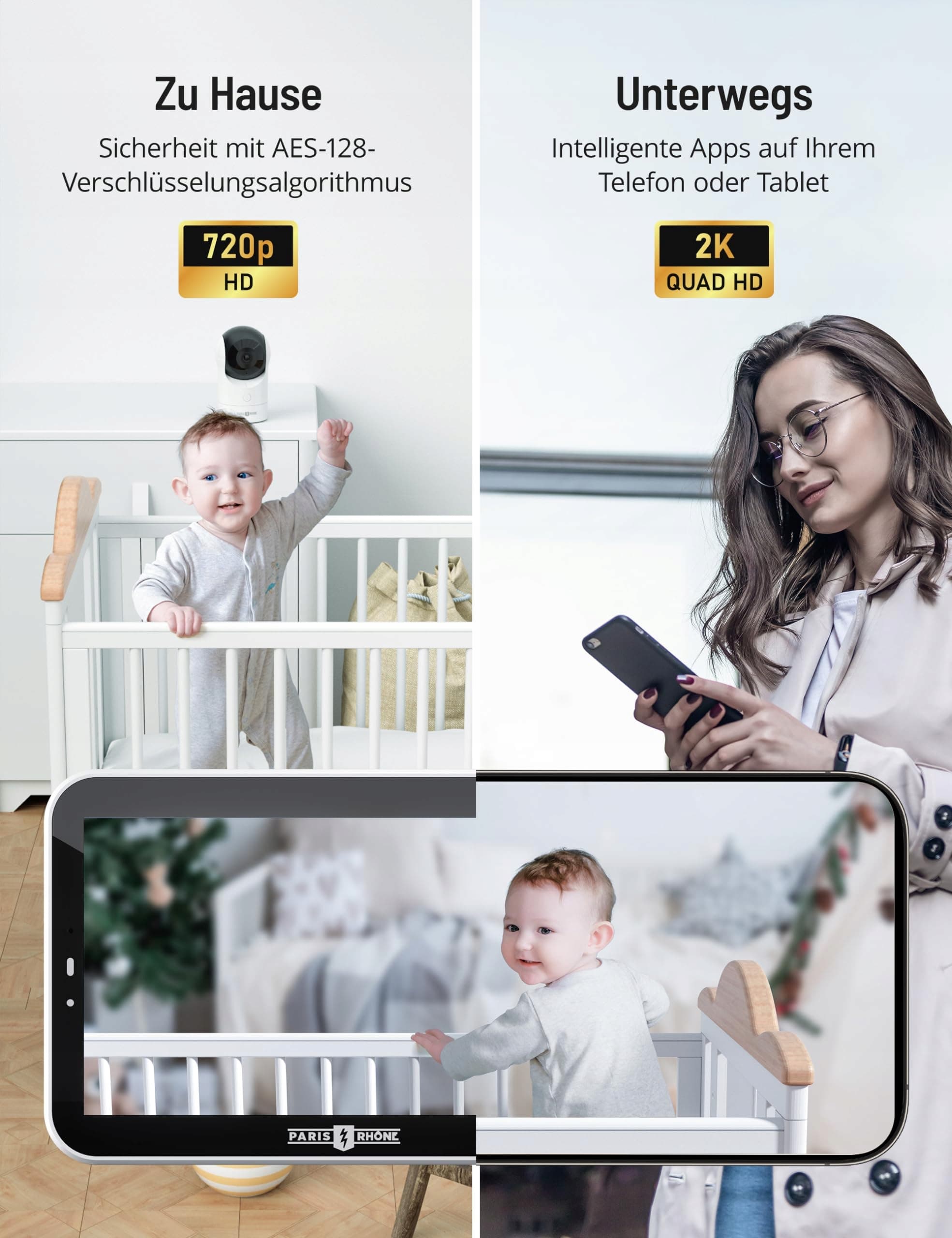 PARIS RHÔNE Babyfon z kamerą i aplikacją, 2K HD 5 cali WLAN Babyfon, PTZ 355° AI-śledzenie, RBG nocna lampka, kołysanki, wykrywanie płaczu/ruchu, pomiar temperatury i wilgotności
