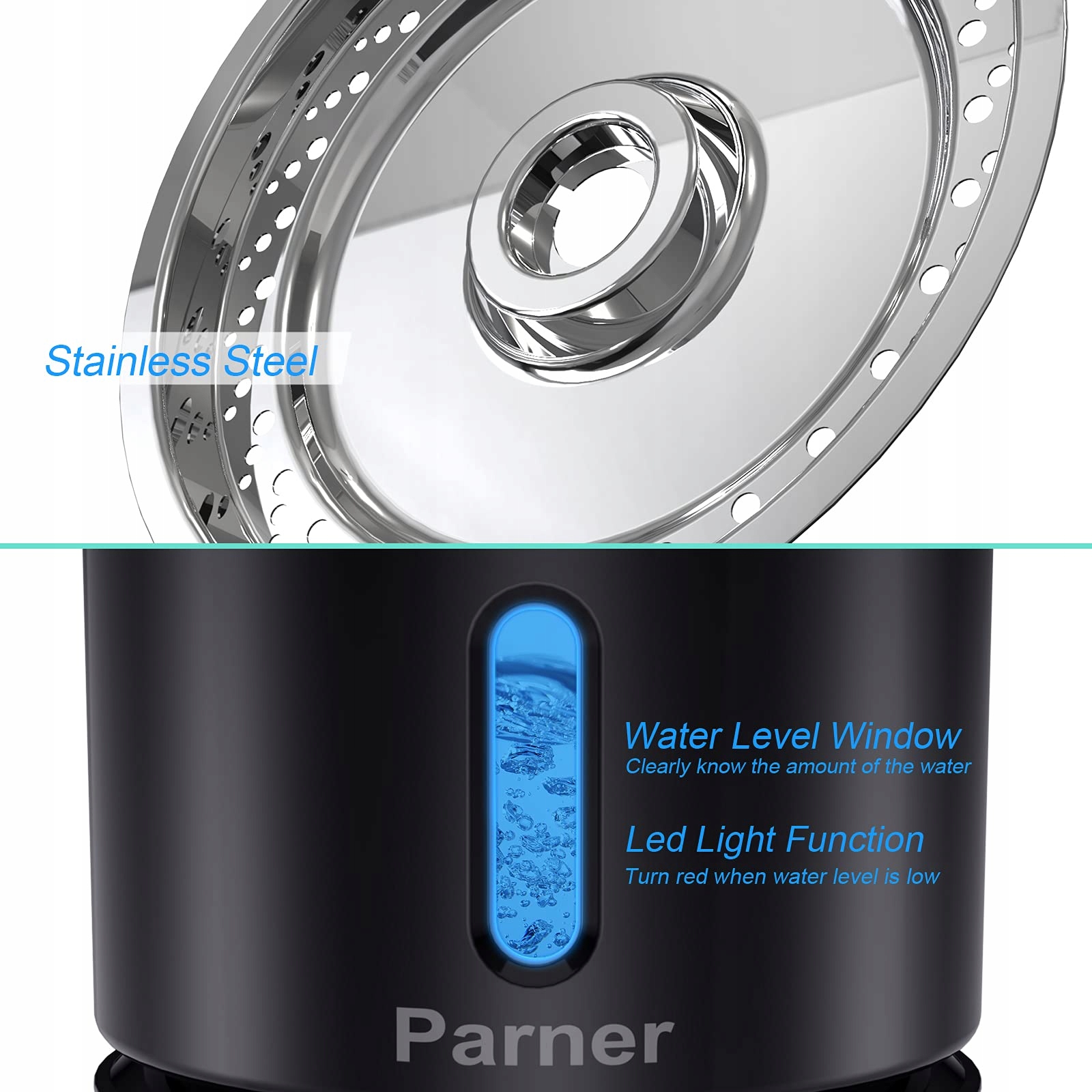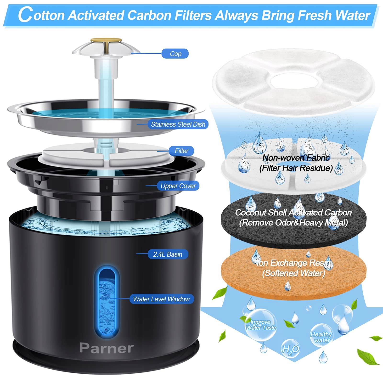 Parner fontanna dla kotów, fontanna do picia z dozownikiem wody dla kotów z okienkiem poziomu wody, 2,4L fontanna dla kotów ze stali nierdzewnej z 4 sztukami filtrów higienicznych i 1 silikonową matą dla zwierząt domowych (WF09)