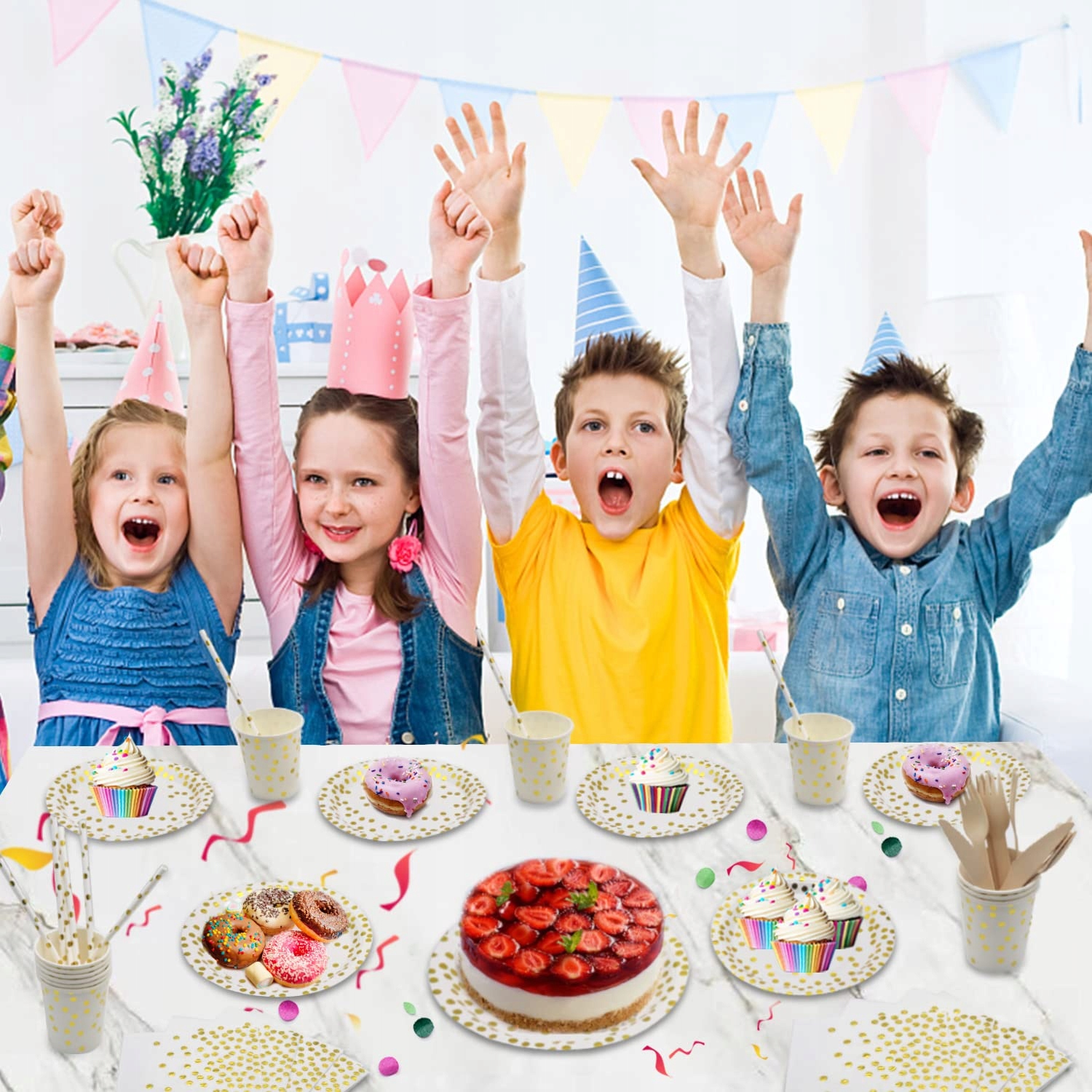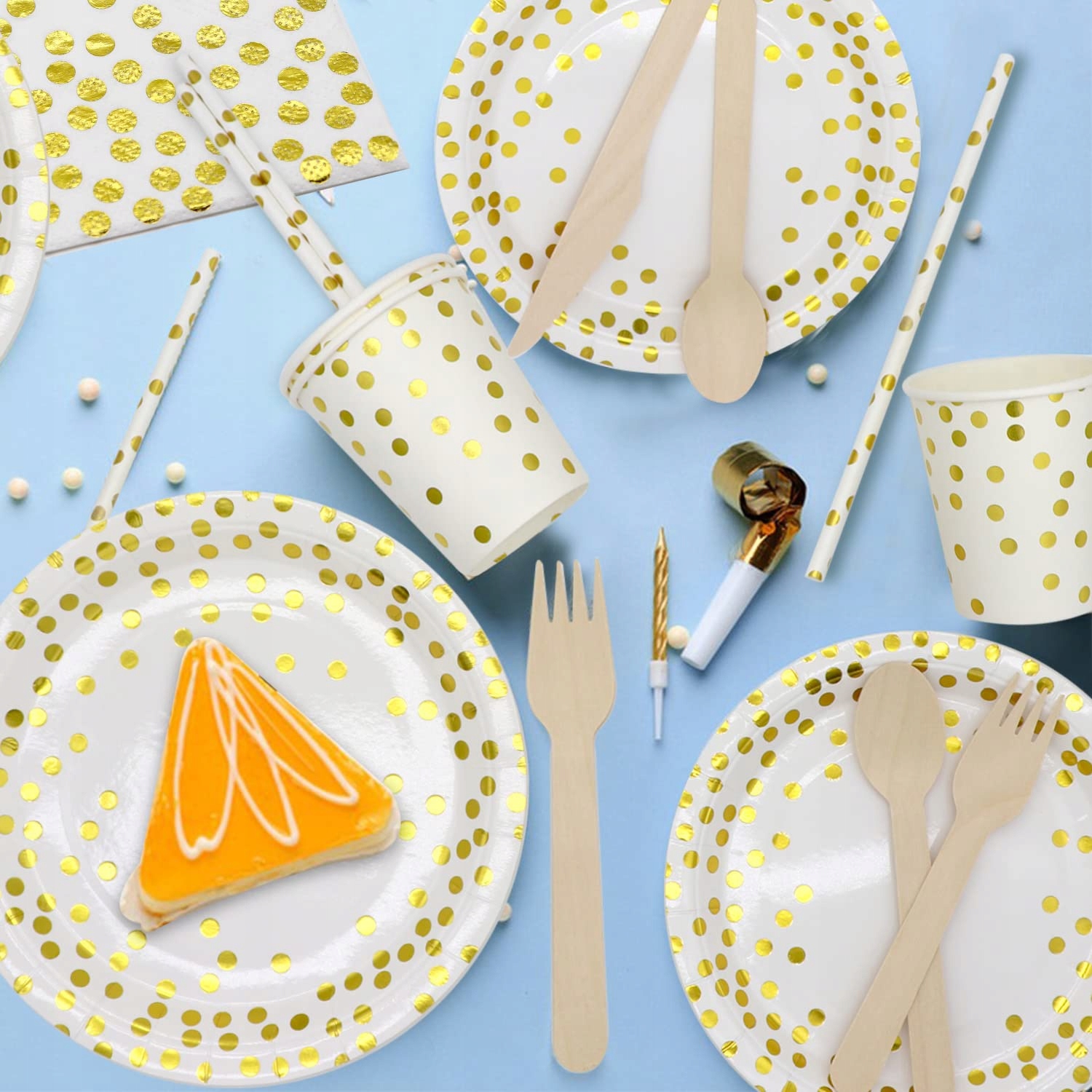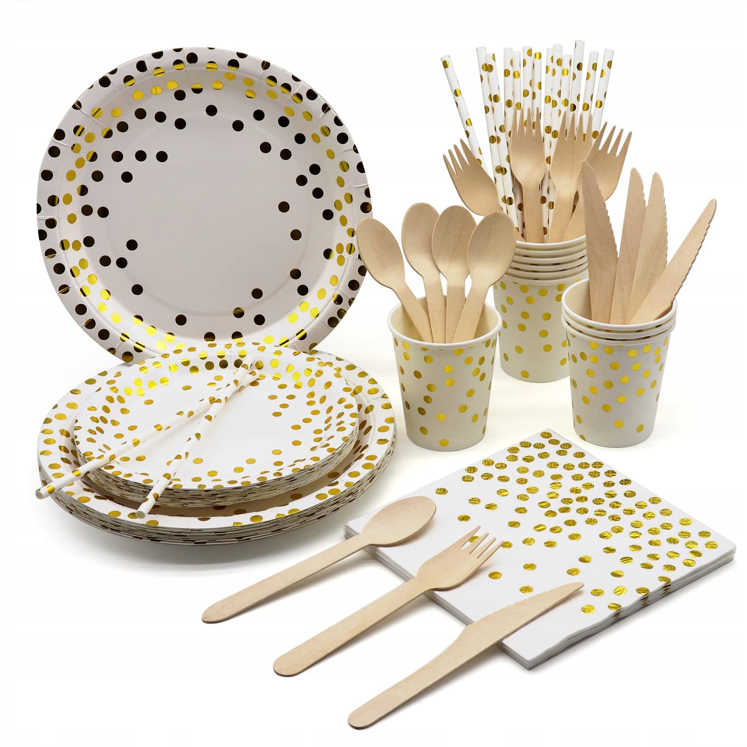 Zestaw naczyń imprezowych na urodziny dziecięce, zestaw 160 papierowych talerzy jednorazowych, kubki papierowe, serwetki, słomki i sztućce - białe złoto