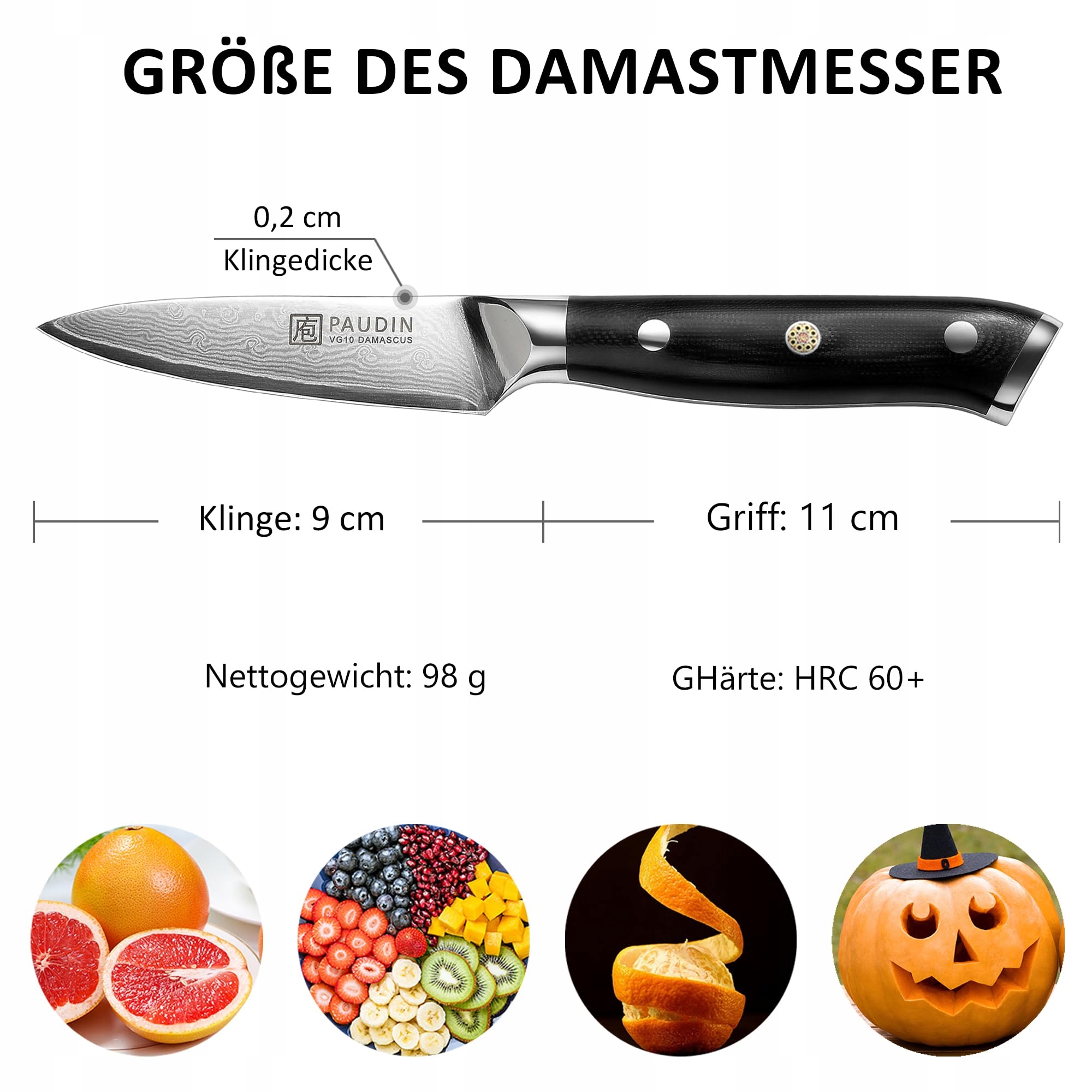 PAUDIN nóż damasceński 9 cm – nóż do warzyw, nóż do obierania, nóż do owoców – VG10 profesjonalny nóż kuchenny z czarną ergonomiczną rękojeścią G10