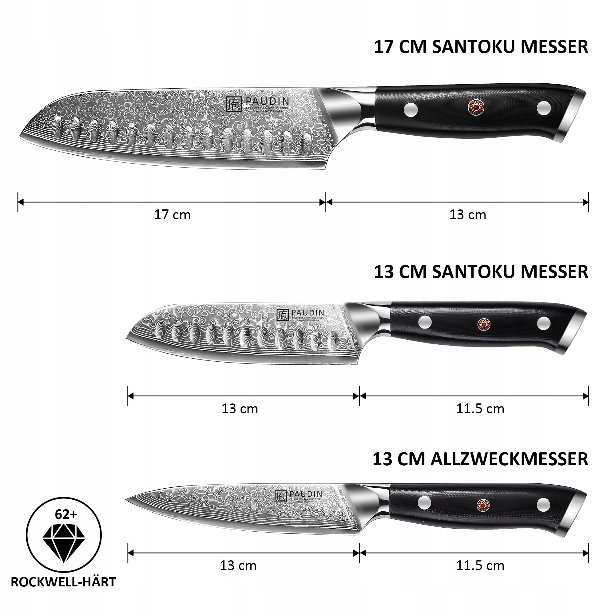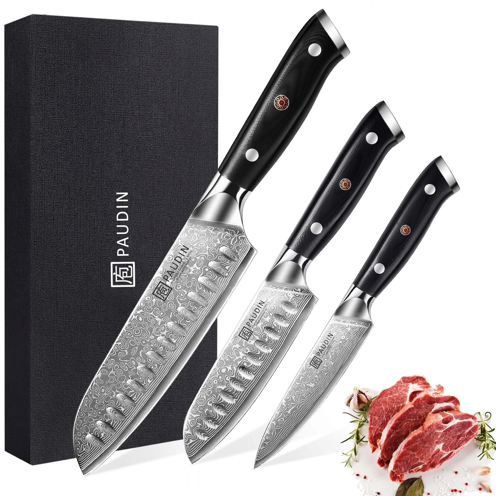 ZESTAW NOŻY DAMASZKOWYCH PAUDIN: 3-częściowy zestaw noży kuchennych damasceńskich spełnia wszystkie Twoje potrzeby kulinarne. Zawiera nóż Santoku 17 cm, mały nóż Santoku 13 cm oraz nóż uniwersalny 13 cm. Zestaw noży kuchennych idealnie nadaje się do codziennego gotowania, krojenia warzyw, owoców lub mięsa.