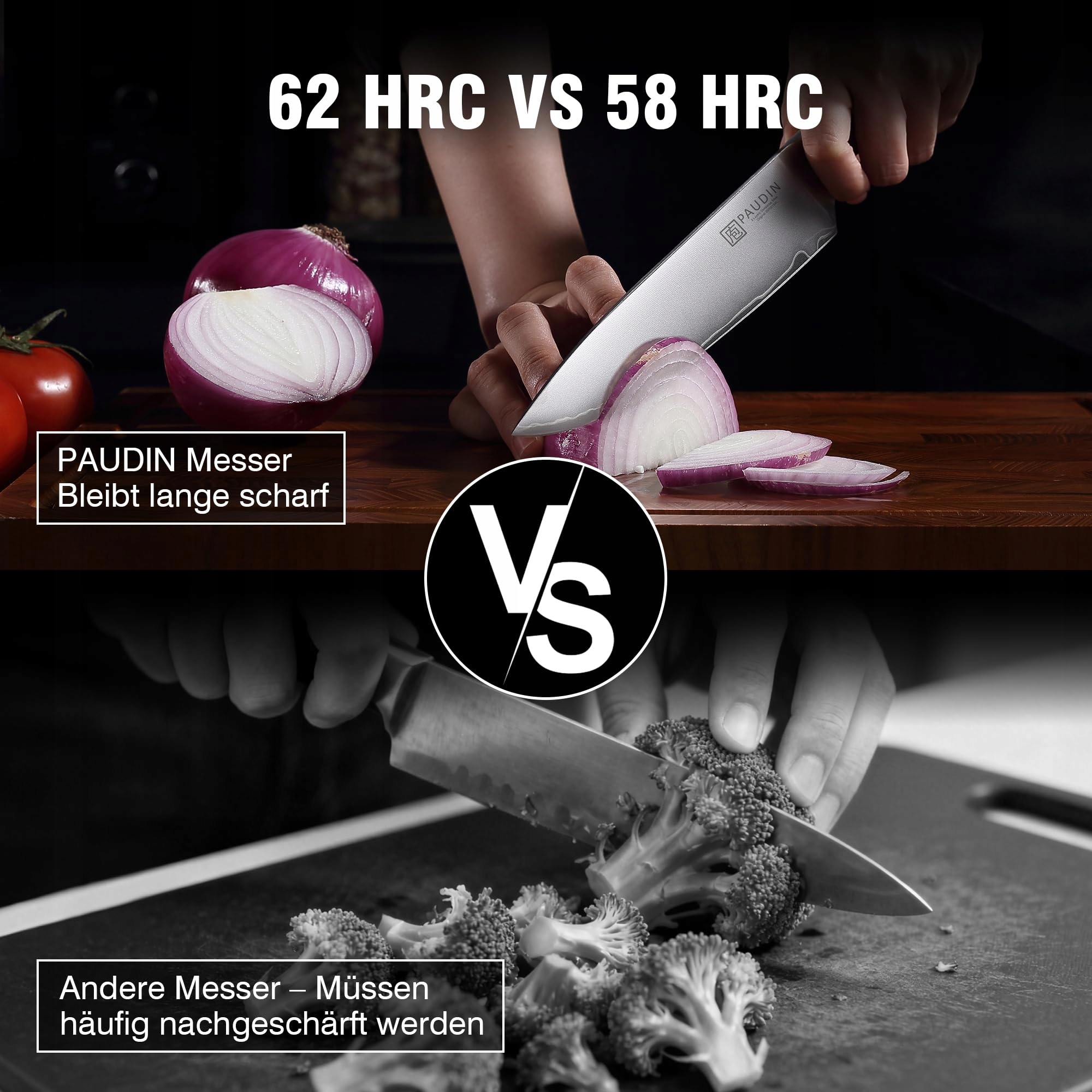 Wysokiej jakości materiały: Wykonane z trójwarstwowej stali kompozytowej 10Cr15CoMoV o twardości 62 HRC – dla wyjątkowej ostrości i zwiększonej odporności na zużycie. Idealne do kwaśnych lub lekko ściernych produktów spożywczych, takich jak pomidory czy cytryny.