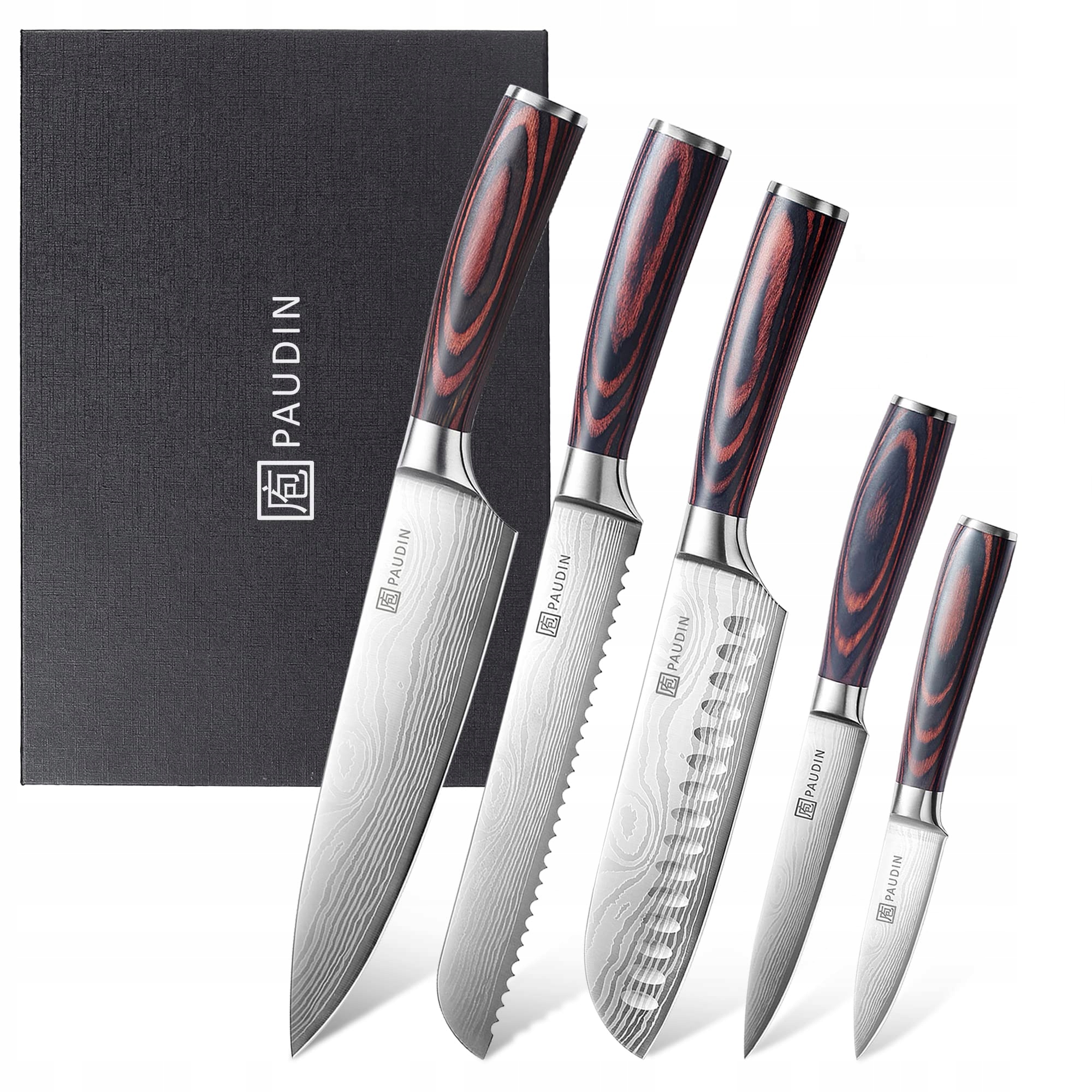 Uniwersalny zestaw noży kuchennych 5-częściowy: Zestaw noży premium PAUDIN obejmuje nóż kuchenny 20 cm, nóż santoku 20 cm, nóż uniwersalny 13 cm, nóż do chleba 20 cm, nóż do warzyw 9 cm. Zestaw noży kuchennych do wszystkich zadań kuchennych.