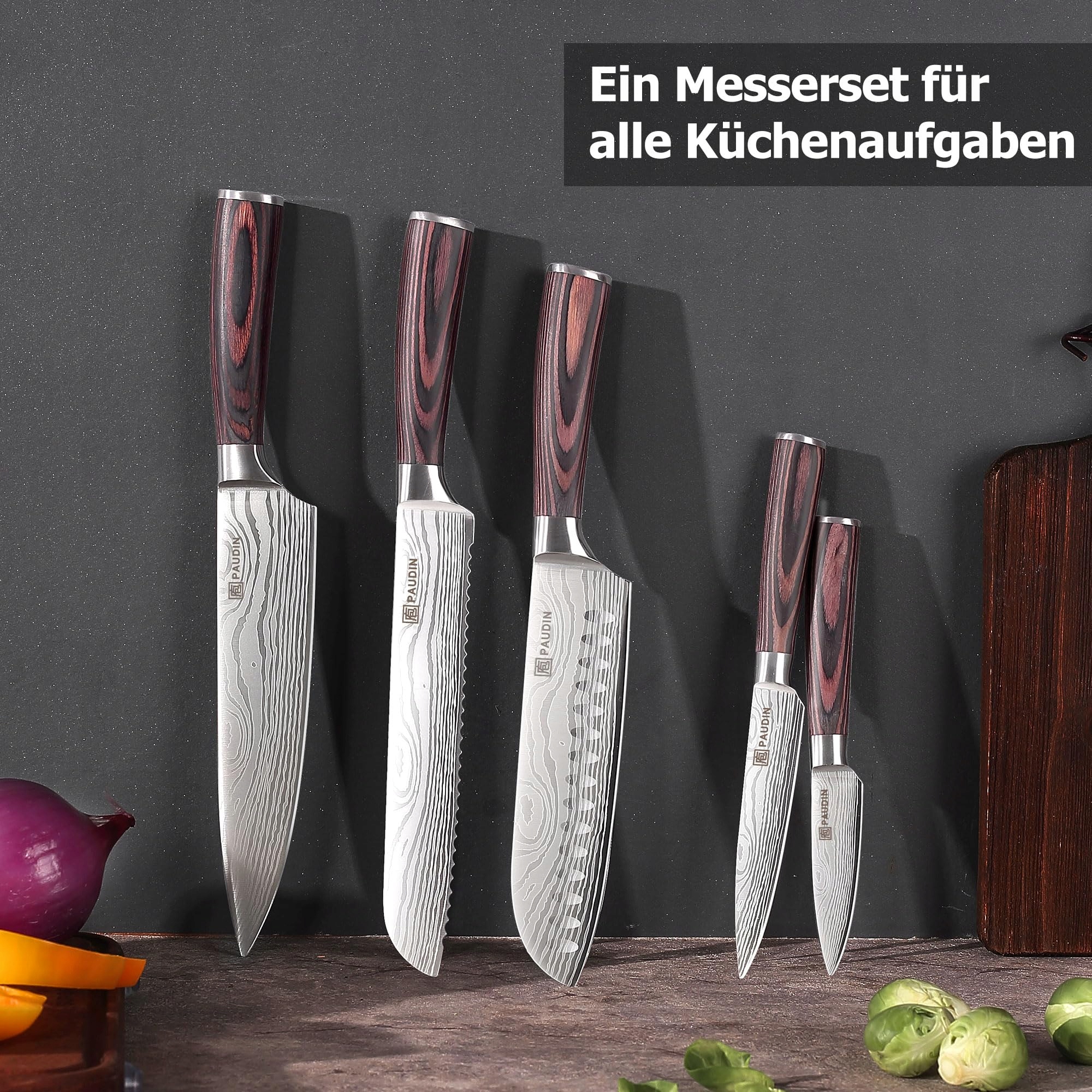 Zestaw noży kuchennych PAUDIN, 5-częściowy zestaw noży kuchennych z wysokiej jakości stali węglowej, ultra ostry zestaw noży z nożem szefa kuchni, nożem do krojenia, nożem uniwersalnym