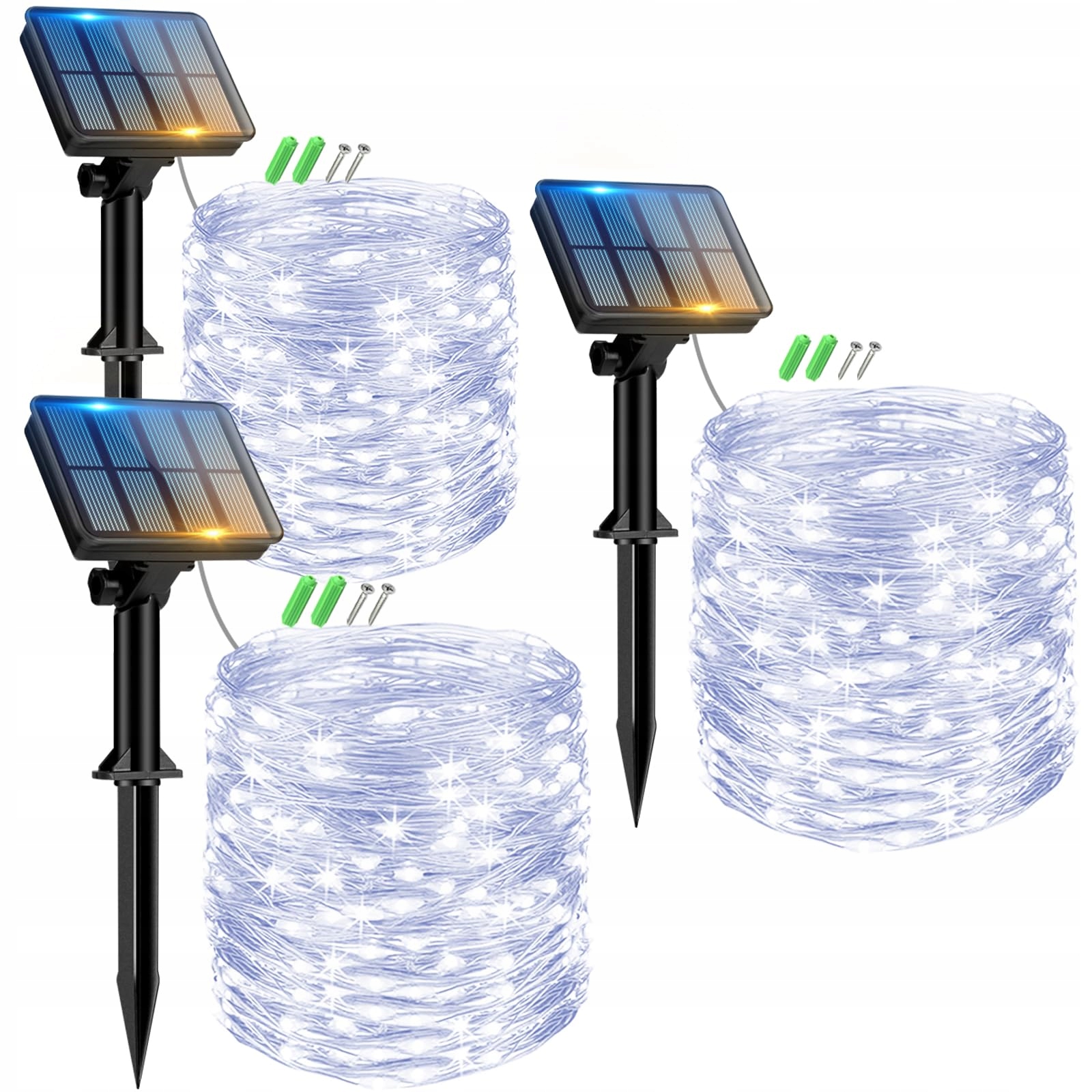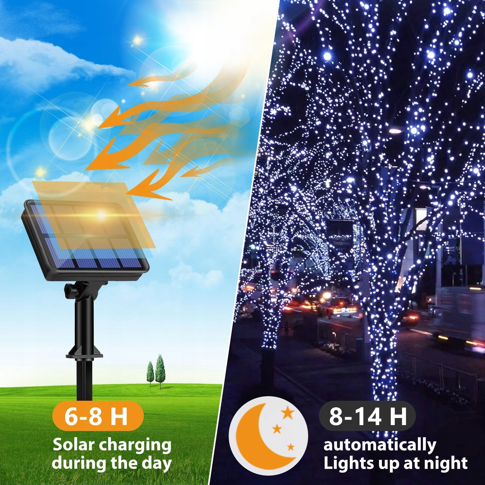 12M 120 LED Solar Outdoor String Lights: Zaktualizowany panel solarny ma większą powierzchnię absorpcji światła słonecznego i wyższą wydajność konwersji energii słonecznej. Dzięki zaktualizowanemu wbudowanemu akumulatorowi NiMH 1,2V/800AH, ten łańcuch świetlny może działać przez 10-12 godzin po pełnym naładowaniu. Każdy łańcuch ma 12 metrów długości i 120 diod LED, które emitują miękkie, zimne białe światło, tworząc romantyczną i przytulną atmosferę na każdą okazję