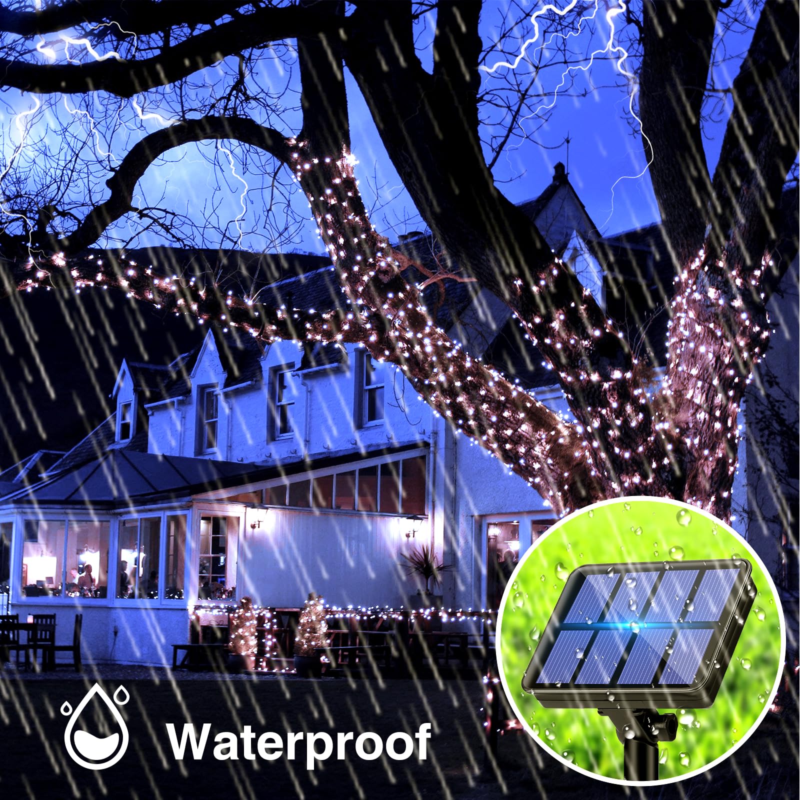 Łańcuch świetlny solarny na zewnątrz, wodoodporny: Ten łańcuch świetlny solarny ma wodoodporną konstrukcję IP65. Nie musisz się martwić o jego używanie podczas deszczu lub w wilgotnym otoczeniu. Niezależnie od tego, czy pada deszcz, śnieg, wieje wiatr, czy jest gorąco, można go używać zarówno wewnątrz, jak i na zewnątrz. Jest to idealne rozwiązanie do dekoracji balkonu, ogrodu i tarasu