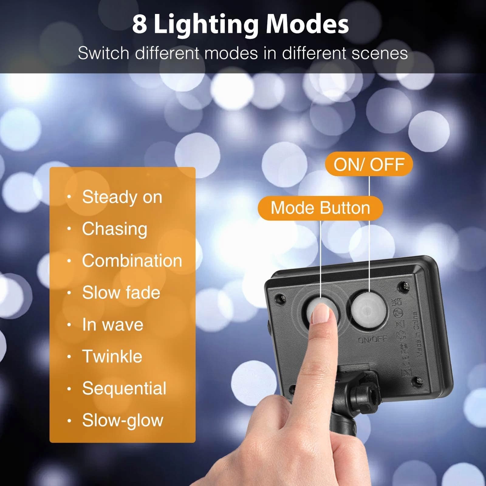 8 trybów oświetlenia: Solarne światła zewnętrzne oferują 8 różnych trybów, aby spełnić Twoje różne potrzeby: migotanie świetlików, falowanie, zanikanie, ściganie/migotanie, powolne zanikanie, iskrzenie/migotanie, stałe światło. 2 przyciski przełączników mogą automatycznie włączać się w ciemności i wyłączać w ciągu dnia, a Twój ostatni wybór zostanie zapisany przez inteligentny chip pamięci. Nie musisz ich resetować