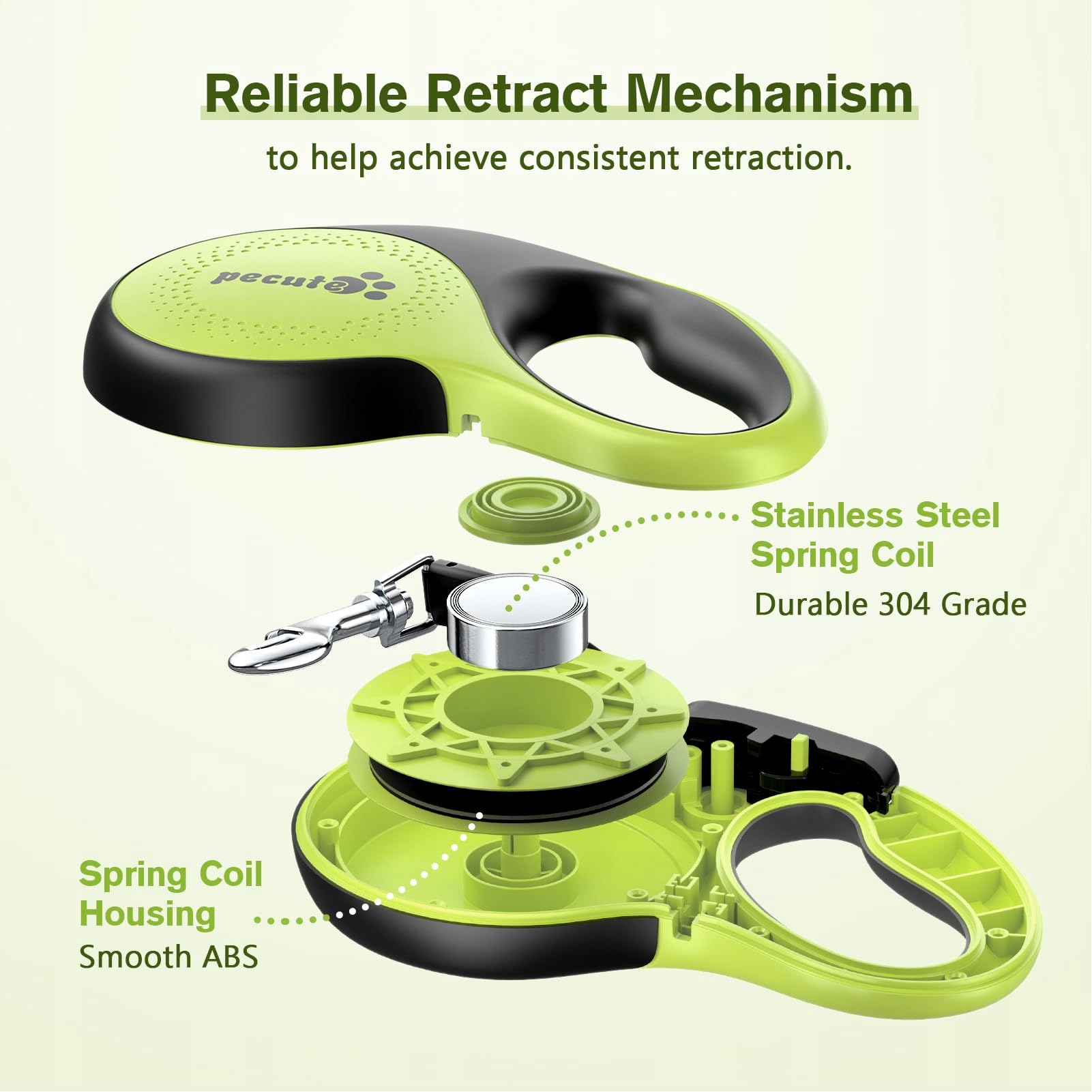 🐾 [Niezawodny mechanizm sprężynowy i system hamulcowy] Wewnętrzny mechanizm wykorzystuje wysokiej jakości sprężyny ze stali nierdzewnej 304, które są mocne i elastyczne, nie plączą się. Dzięki wygodnemu i prostemu systemowi hamowania jednym przyciskiem możesz pozwolić swojemu futrzanemu przyjacielowi na eksplorację, zablokować smycz na miejscu lub delikatnie ją cofnąć.