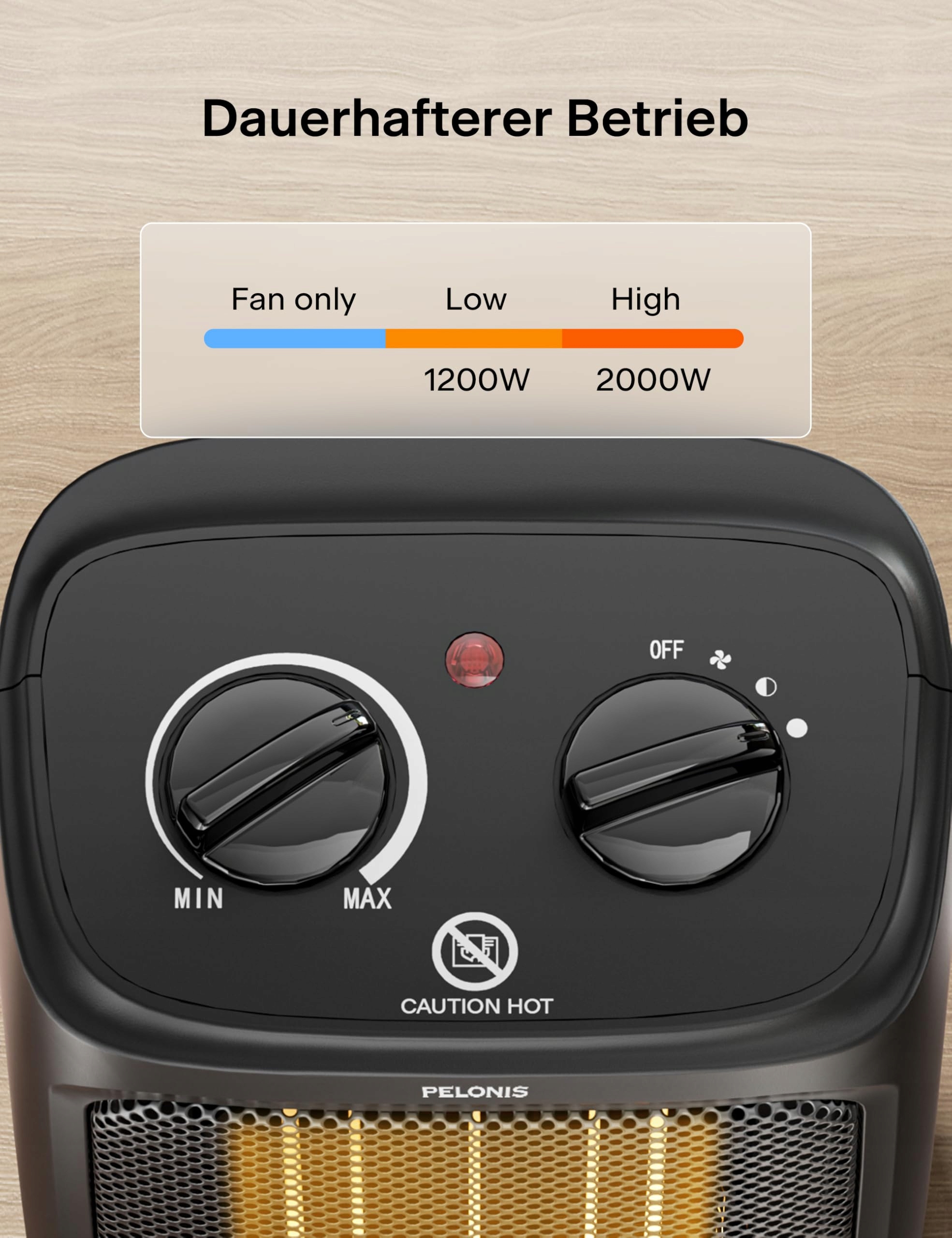 2 ustawienia energii i tryb wentylatora: W tym 2000 W (wysoki), 1200 (niski) i delikatny tryb wentylatora. Wystarczy obrócić pokrętło, aby ustawić żądaną temperaturę i moc. Szybko ogrzej zimne powietrze wokół siebie i oszczędzaj energię