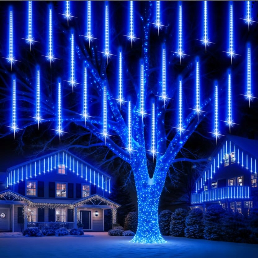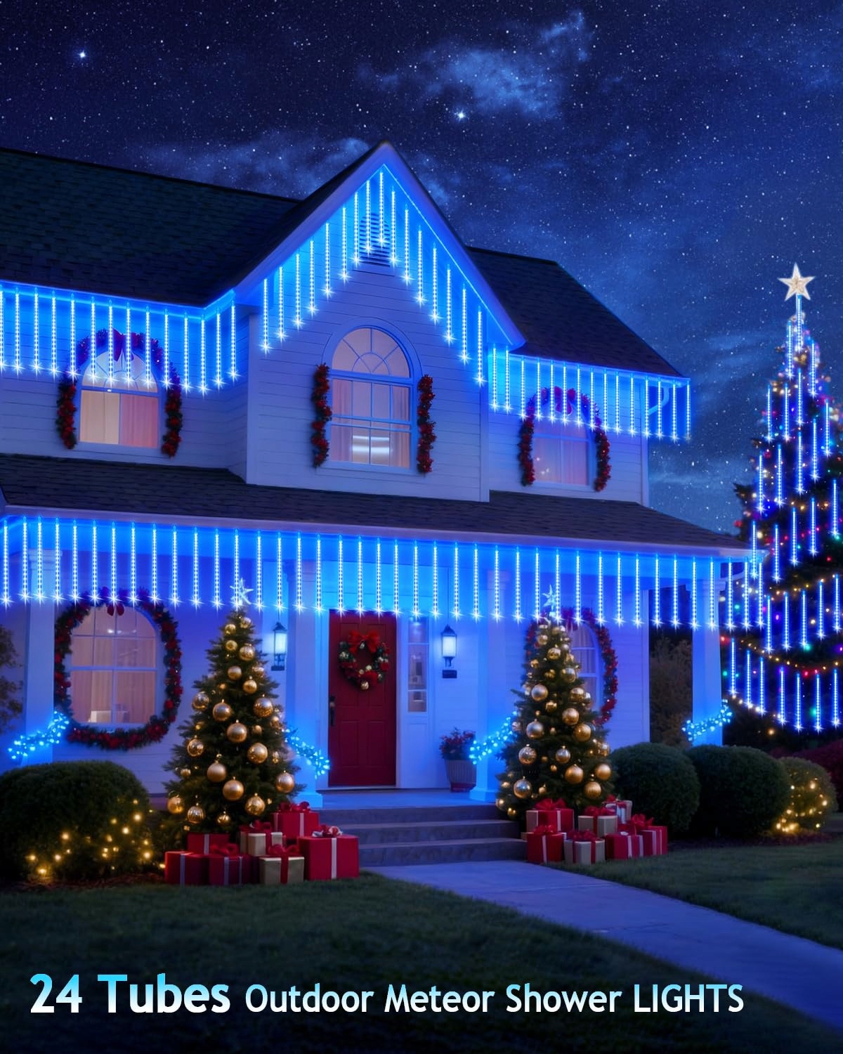 PEMOTech Oświetlenie świąteczne na zewnątrz, 24 rury 30 CM 576 diod LED łańcuch świetlny z efektem sopli lodu na zewnątrz, wodoodporne spadające światła deszczu na Boże Narodzenie Halloween choinka, dekoracja świąteczna na zewnątrz, niebieskie
