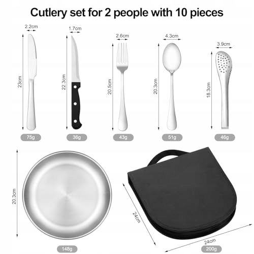 penobon Zestaw naczyń kempingowych dla 2 osób, 10-częściowy przenośny zestaw sztućców kempingowych ze stali nierdzewnej na kemping, piknik, podróże