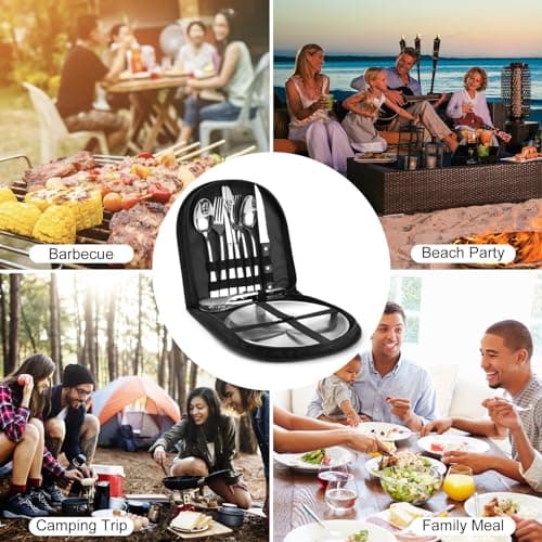 【Kompletny zestaw naczyń】 Ten zestaw sztućców kempingowych zawiera: nóż stołowy*2, łyżka*2, widelec*2, nóż do steków*1, szczypce do jedzenia*1, talerz obiadowy*2 oraz praktyczną torbę do przenoszenia, idealny na kemping, pikniki i inne aktywności