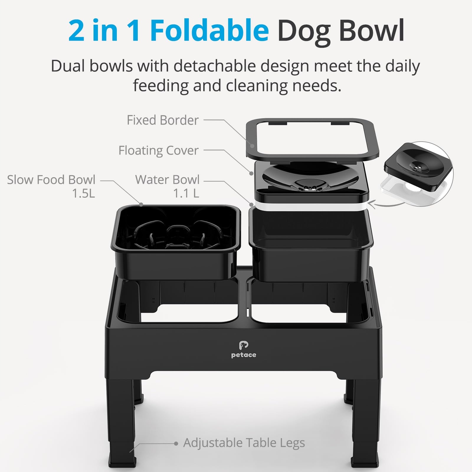 IDEALNE DLA WSZYSTKICH ETAPÓW ŻYCIA: Podwyższone miski Petace można ustawić na 4 różne wysokości, aby spełnić potrzeby. Wystarczy nacisnąć 4 przyciski na nogach stołu, aby ustawić wysokość na 8,6 cm dla małych szczeniąt i kotów, 20,5 cm, 24,6 cm dla średnich i dużych psów oraz 28,7 cm dla psów dużych ras