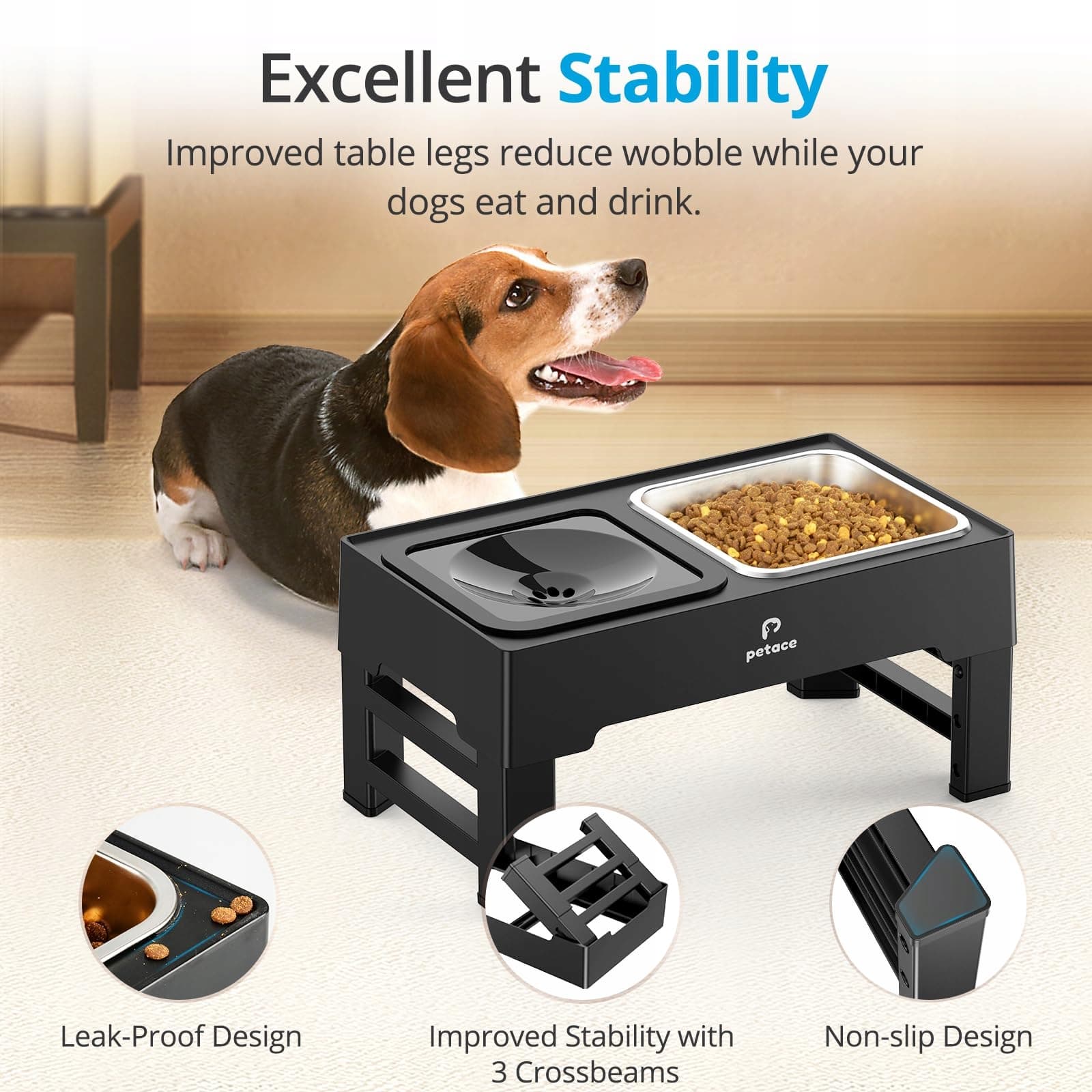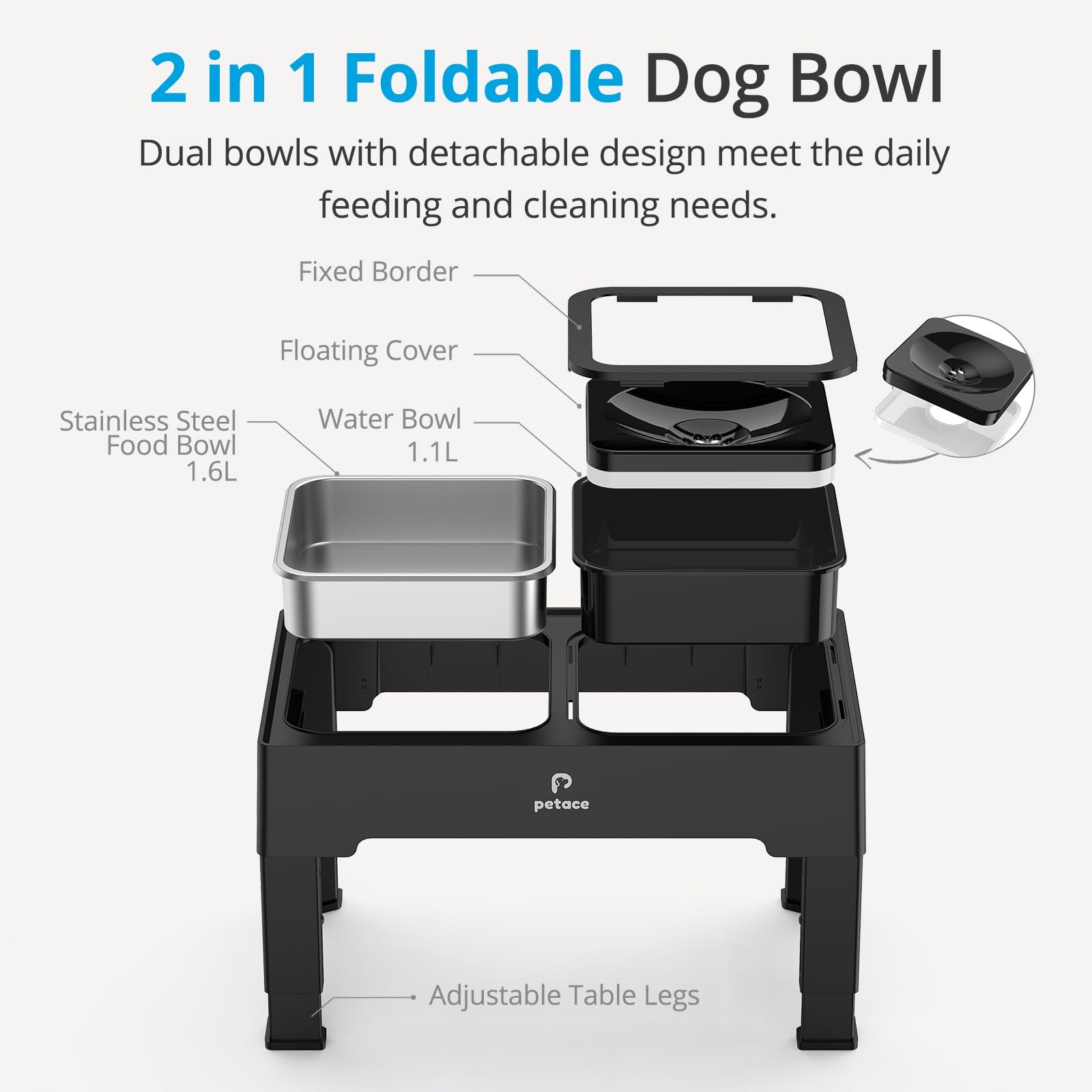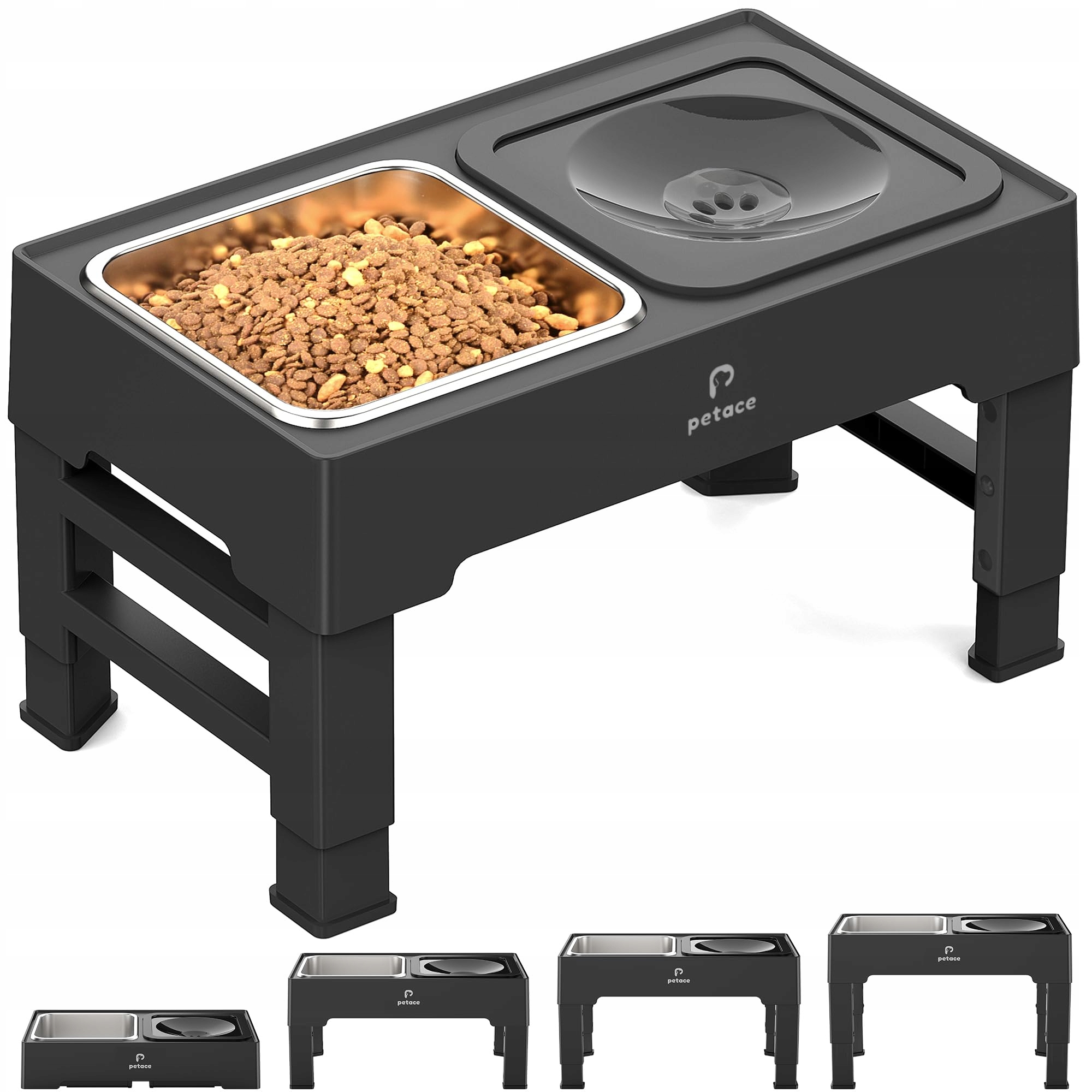 IDEALNE NA WSZYSTKIE ETAPY ŻYCIA: Podwyższone miski dla psów Petace można ustawić na 4 różne wysokości, w zależności od potrzeb. Po prostu ustaw wysokość, naciskając 4 przyciski na nogach stołu na 8,7 cm dla małych szczeniąt i kotów, 20,5 cm, 24,6 cm dla średnich i dużych psów oraz 28,8 cm dla psów dużych ras