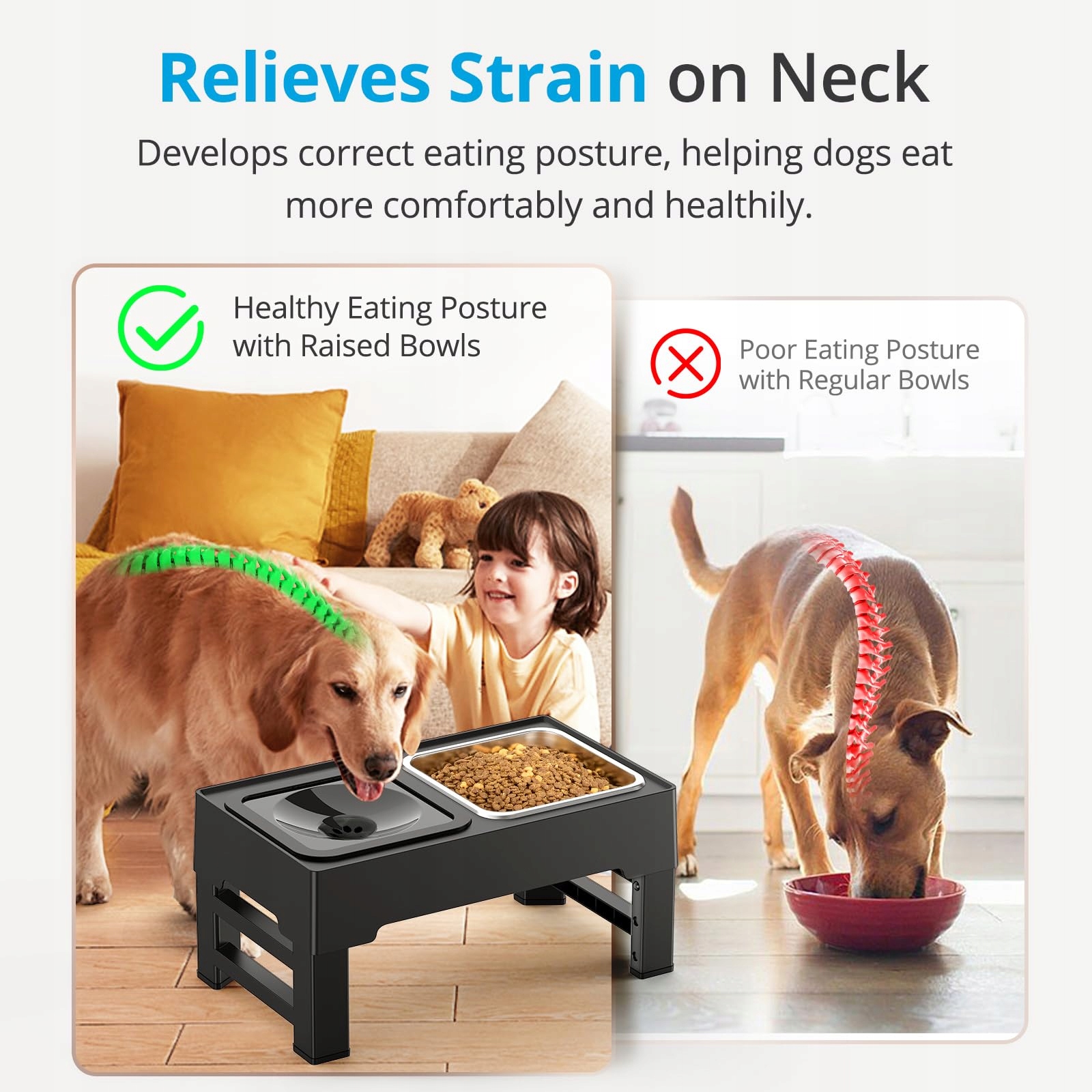 REDUKUJE OBCIĄŻENIE STAWÓW: Używanie podwyższonych misek dla psów pomaga zmniejszyć obciążenie stawów i kości oraz sprzyja zdrowszej postawie ciała. Podwyższone miski są idealne dla starszych psów i stanowią doskonałą podwyższoną miskę dla dużych psów