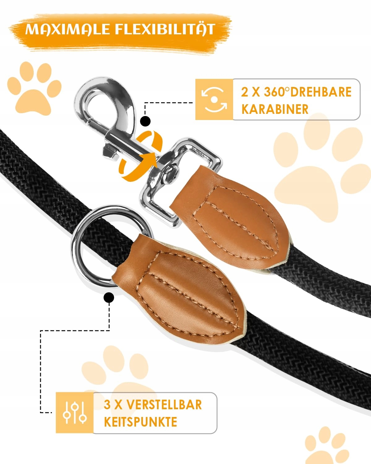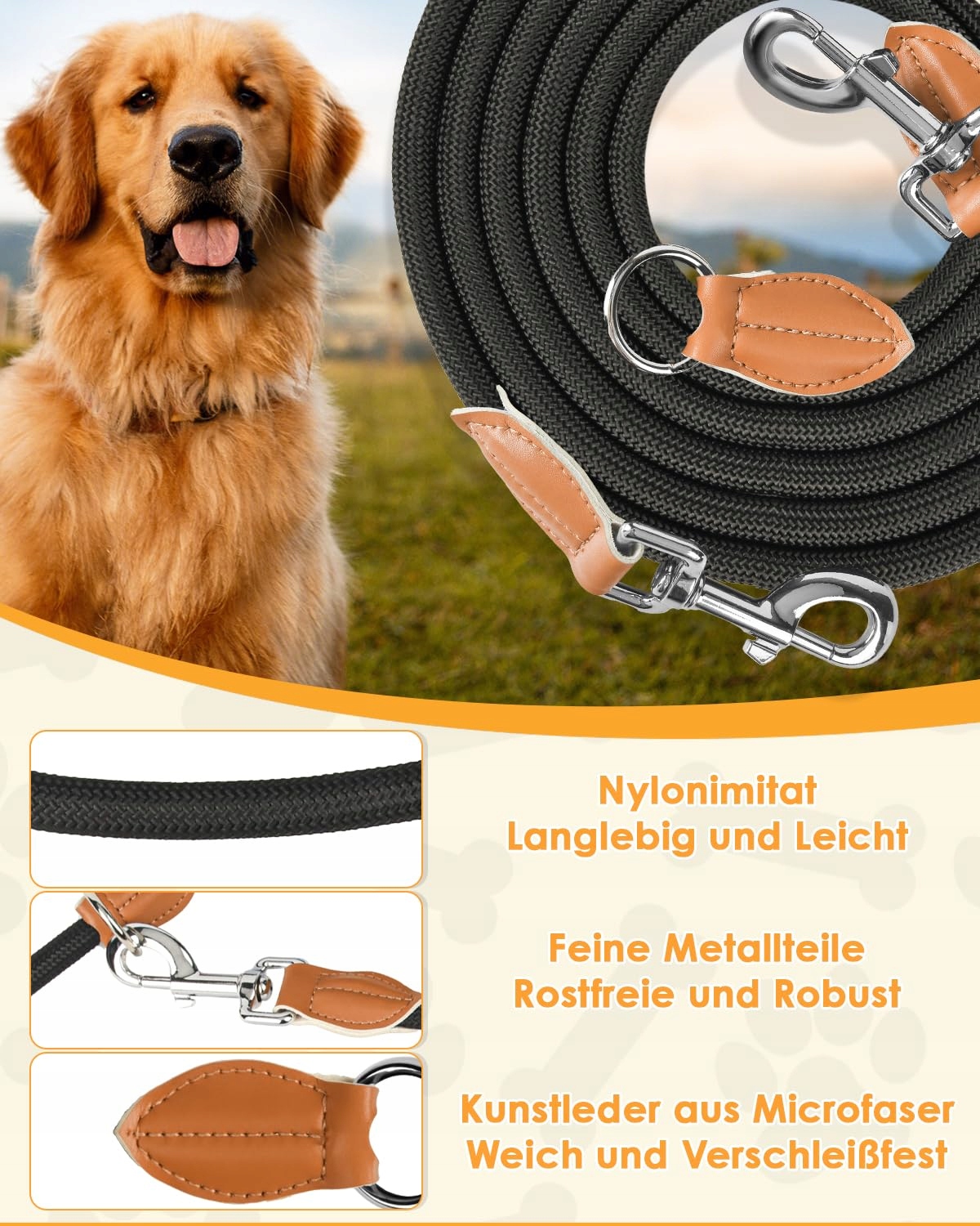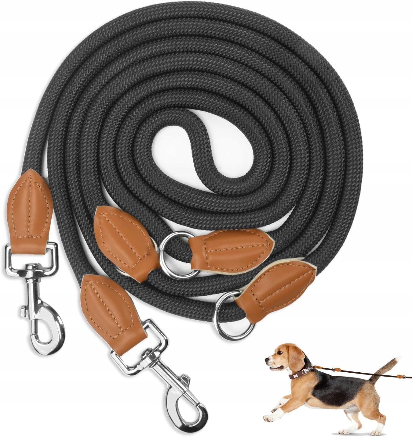 🐾🐕[Mocna i trwała]Ta smycz do biegania ma 3 pierścienie D i dwa karabińczyki, a smycz treningowa nie plącze się i nie wiąże łatwo. Również nasadka łącząca wykonana jest z wysokiej jakości skóry. Wykazuje dobrą odporność na rozdarcia, warunki atmosferyczne, brud i zużycie