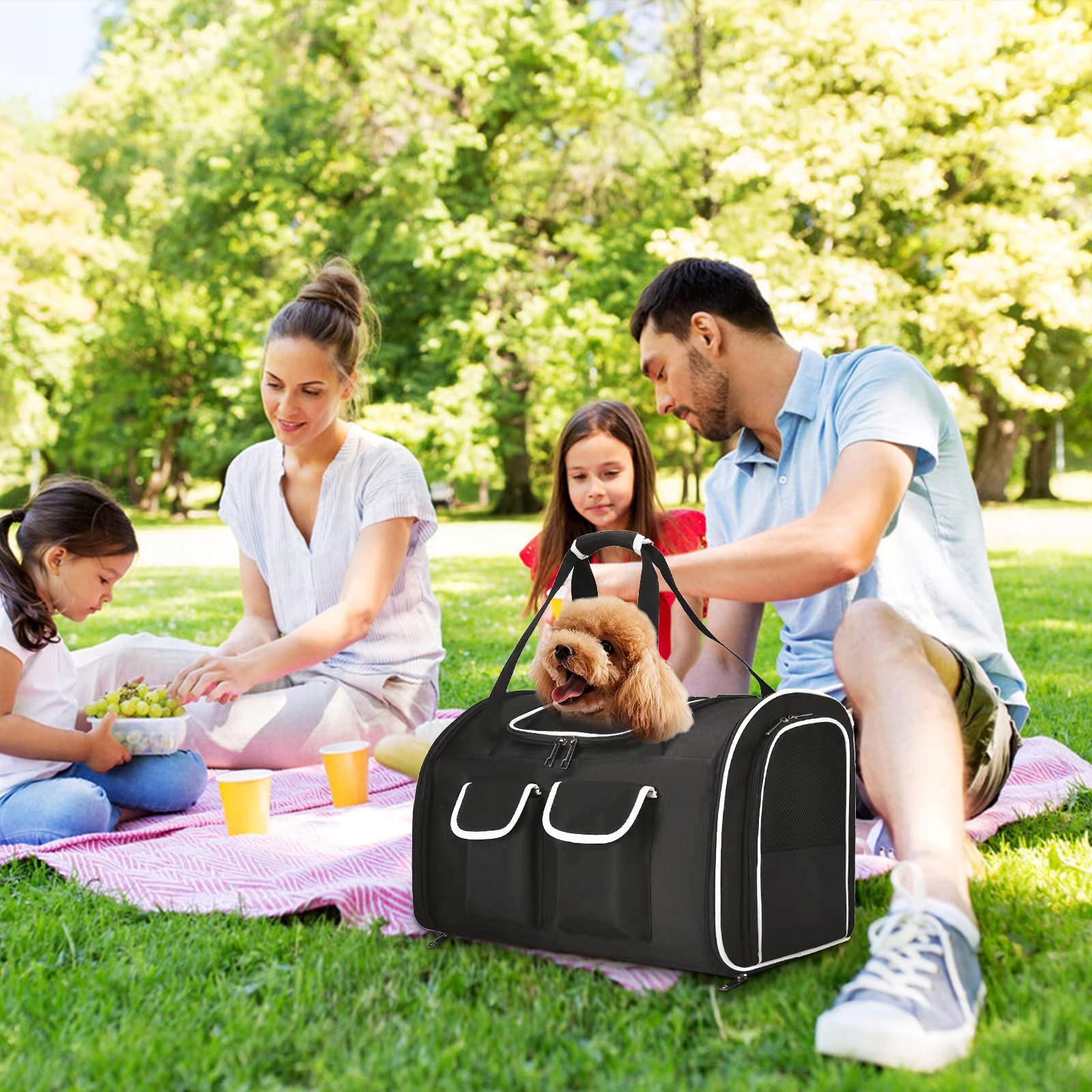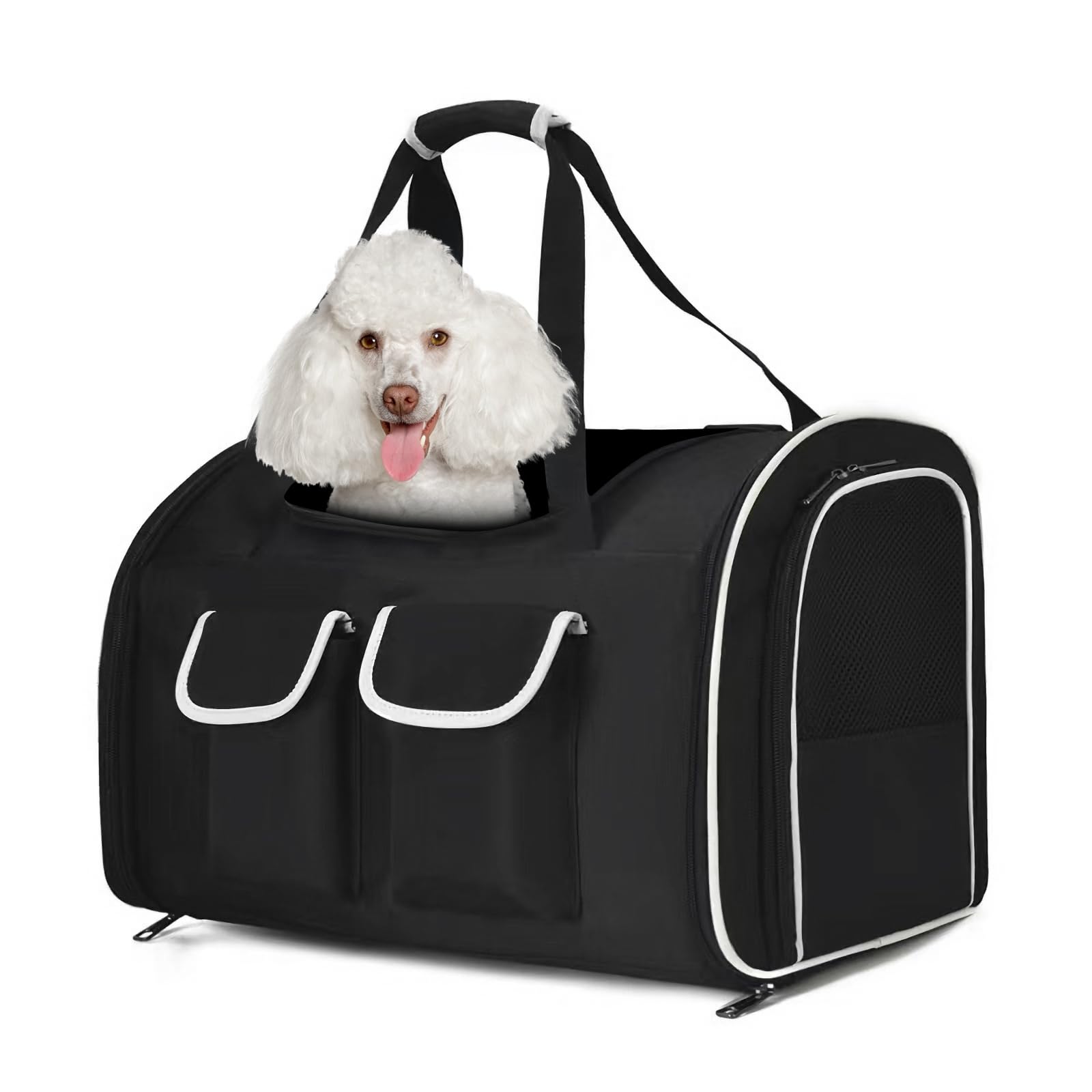 [Wielofunkcyjny design] Nasz plecak dla psów to nie tylko plecak, może być również torebką. Zamek błyskawiczny plecaka ma dwukierunkowy design, przełącznik jest swobodny i zwierzę nie może go samodzielnie otworzyć. Przednie podwójne kieszenie na przechowywanie mogą pomieścić akcesoria dla zwierząt, takie jak kubki, klucze.