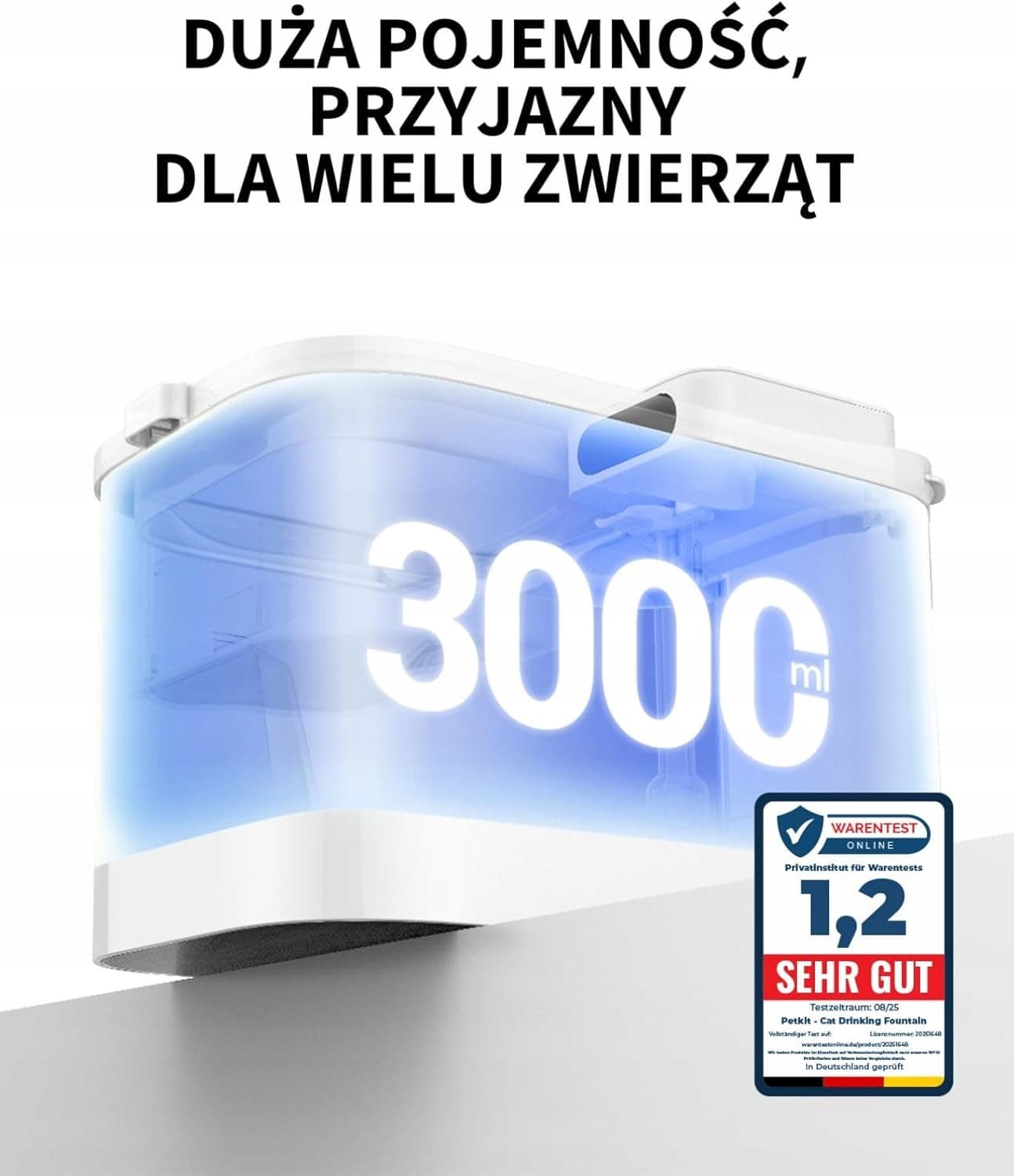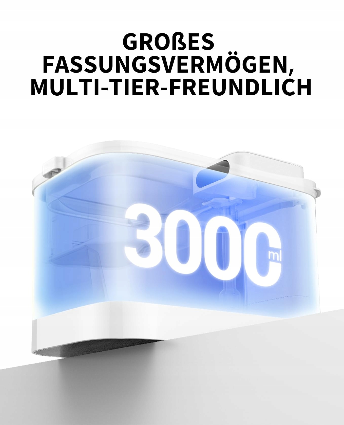 Duża pojemność 3L: Dzięki pojemności 3 litrów ta fontanna dla kotów oszczędza częste uzupełnianie. Idealna dla gospodarstw domowych z wieloma zwierzętami – jedno napełnienie wystarcza, aby zapewnić świeżą wodę dwóm kotom lub jednemu psu przez tydzień.