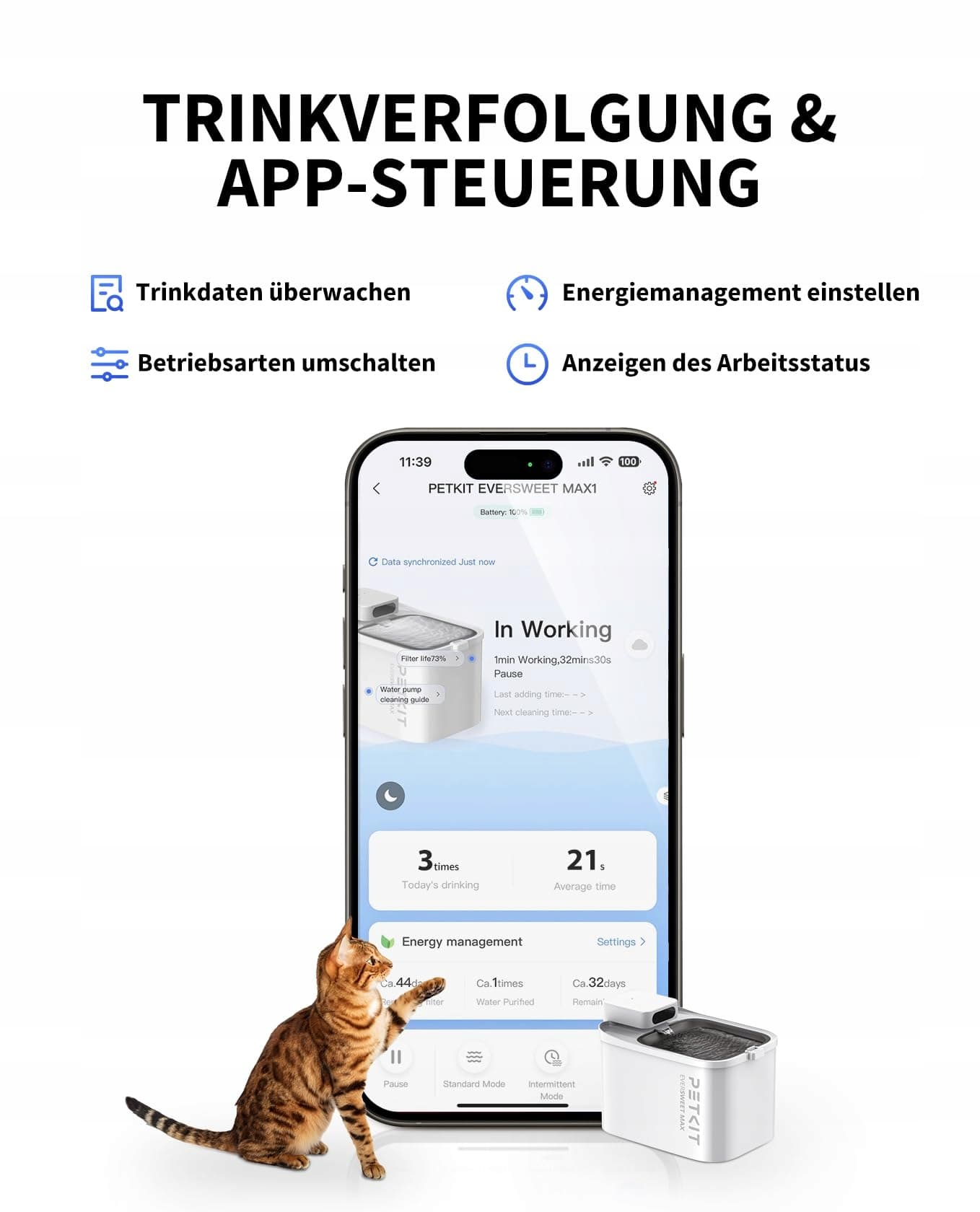 Inteligentna aplikacja PETKIT: Aplikacja PETKIT oferuje cotygodniowe i comiesięczne raporty dotyczące nawyków picia Twojego zwierzęcia. Możesz monitorować historię picia, codzienną częstotliwość i czas trwania w czasie rzeczywistym, przez całą dobę. Dzięki funkcji przypomnienia w aplikacji zawsze wiesz, kiedy należy wymienić filtr lub wyczyścić fontannę.