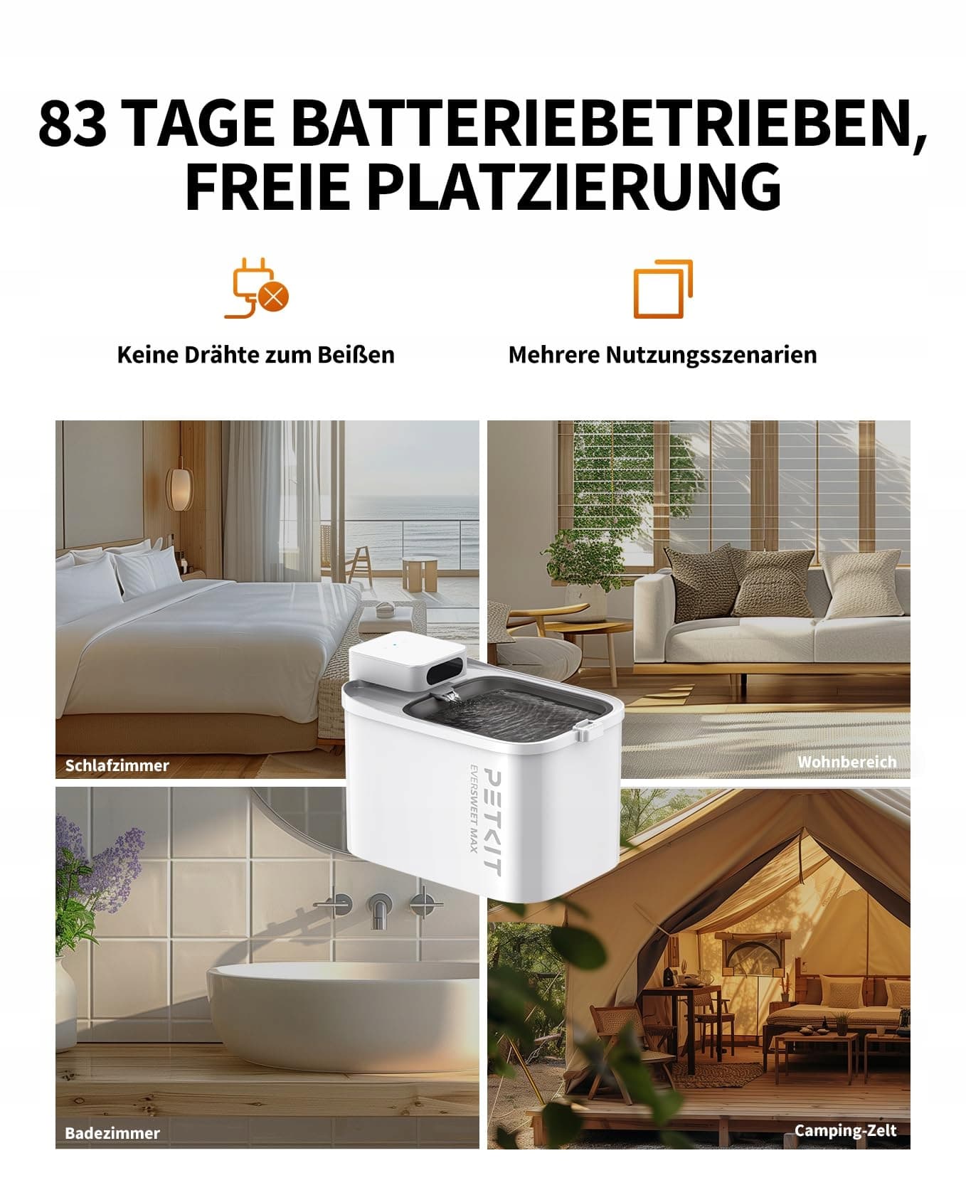 Bezprzewodowa fontanna dla kotów: Nowa i ulepszona bezprzewodowa fontanna dla kotów od PETKIT nie wymaga stałego podłączenia do prądu i może być elastycznie umieszczona w kuchni, sypialni, na balkonie lub w dowolnym innym miejscu. Dzięki wydajnemu akumulatorowi o pojemności 5000mAh możliwy jest czas pracy do 83 dni. Obawy związane z przerwami w dostawie prądu lub krótkimi podróżami należą do przeszłości.