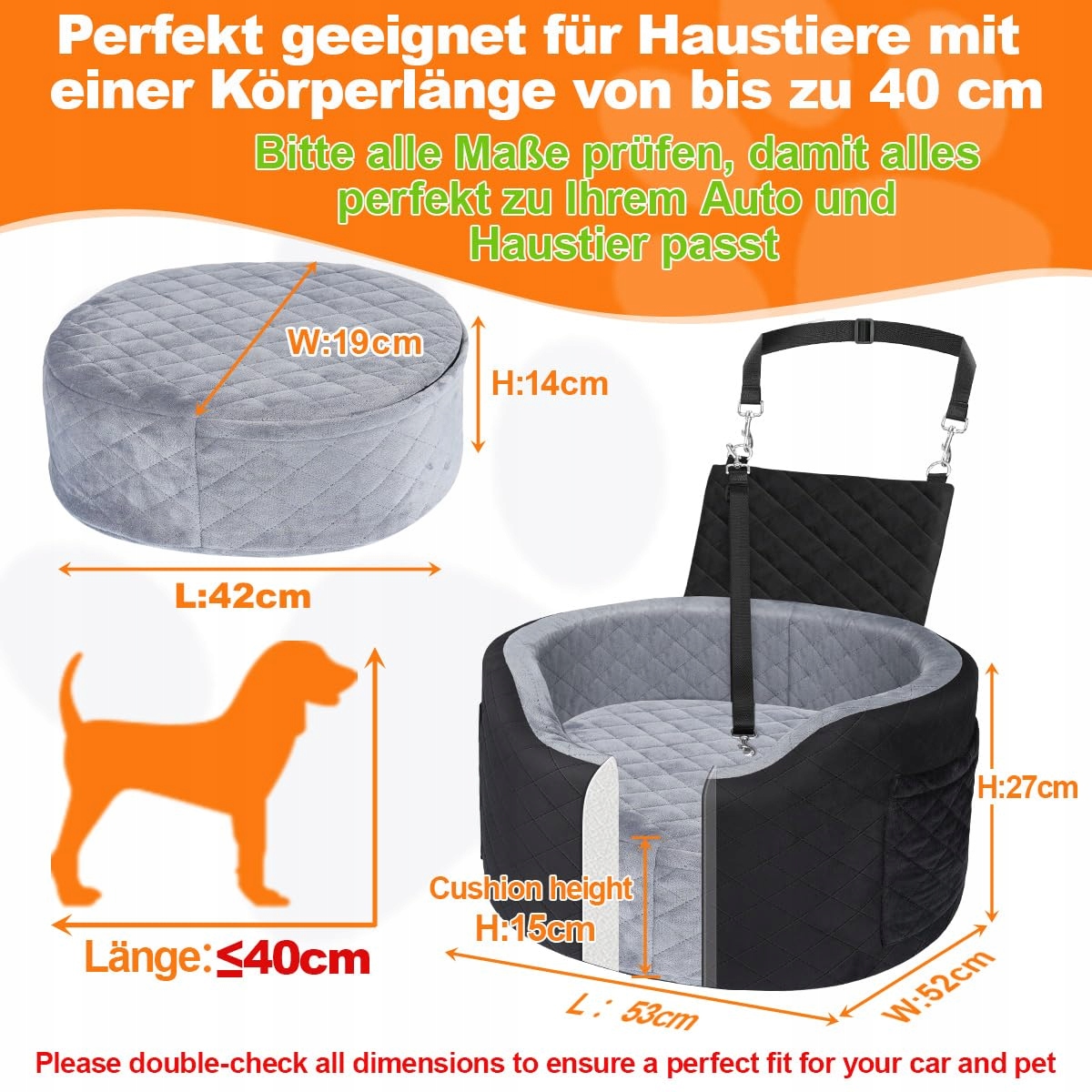Fotelik samochodowy dla małych psów – Czarny fotelik wzmacniający z pianką Memory Foam 28D, antypoślizgowy wodoodporny pokrowiec, łóżko podróżne z kieszeniami na akcesoria i kocem, czarny