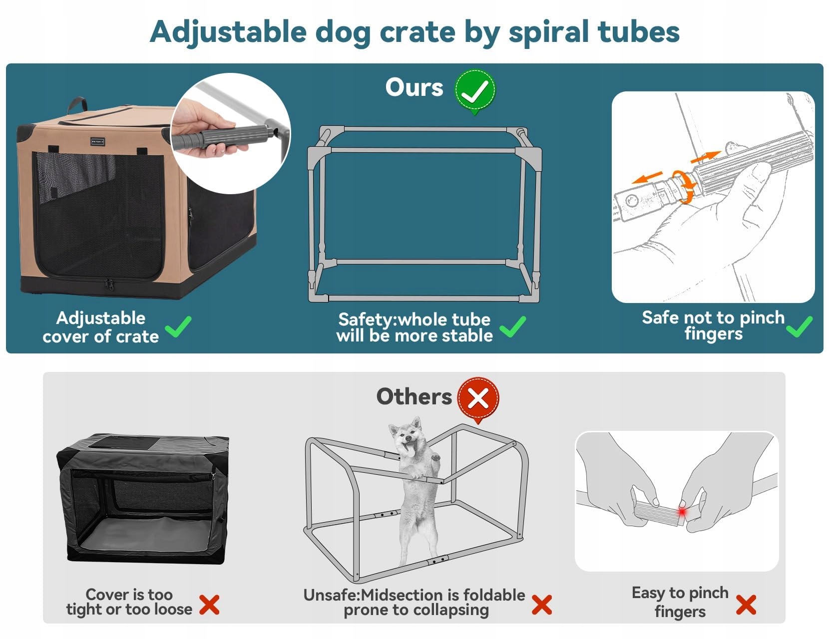 Ta transportbox dla psa do samochodu jest zaprojektowana jako stabilna całość, bez składanych części w środku, aby zapewnić stabilność strukturalną i zapobiec zapadaniu się lub przycięciu psa. Dzięki temu psy mogą w niej stać, leżeć i opierać się o wewnętrzne stalowe rurki.