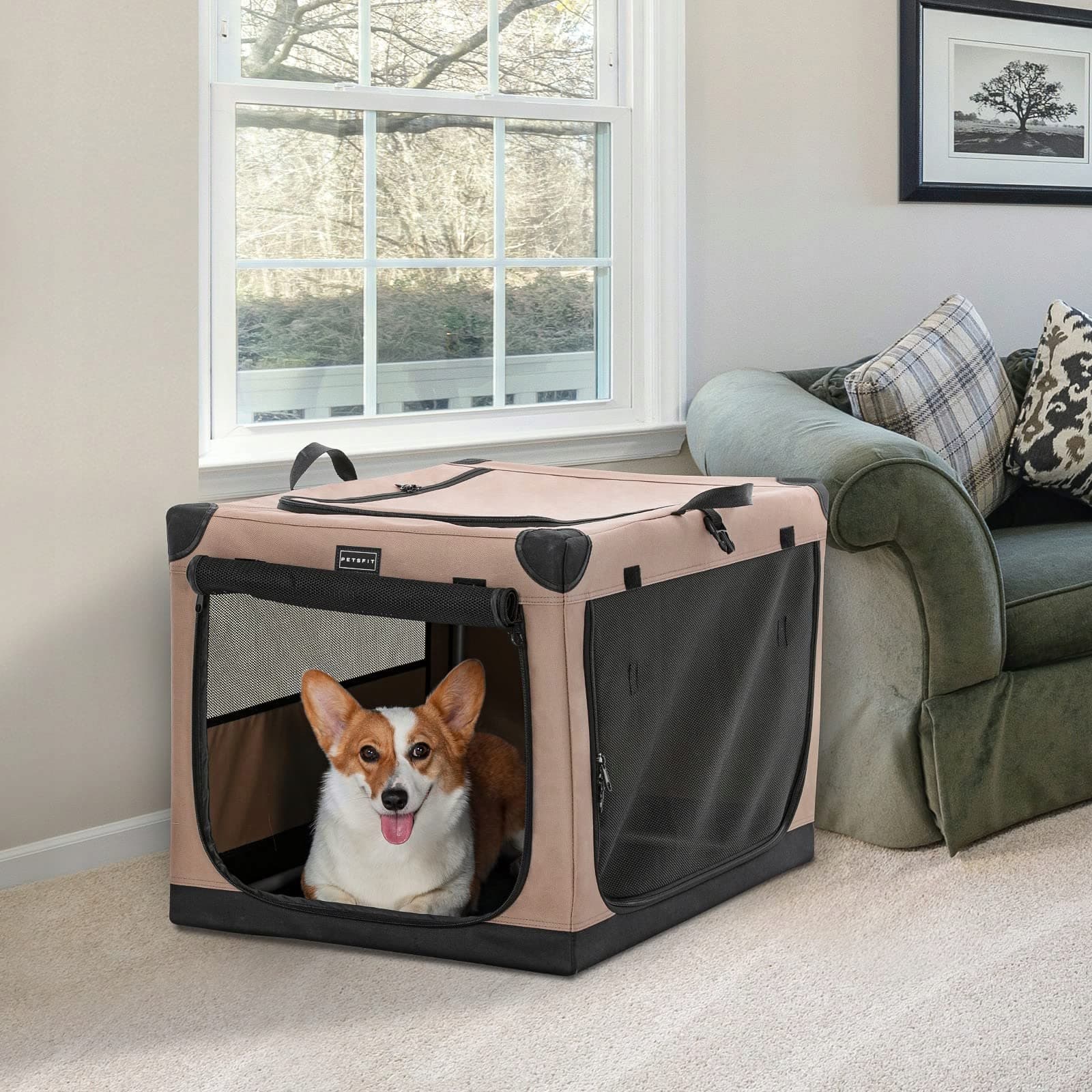 Petsfit Transportbox dla psa do samochodu, regulowana pokrywa z tkaniny ze spiralną rurką żelazną, składana klatka dla psa z 3-drzwiowym designem, łatwa do przenoszenia, łatwa do przechowywania, M, Khaki