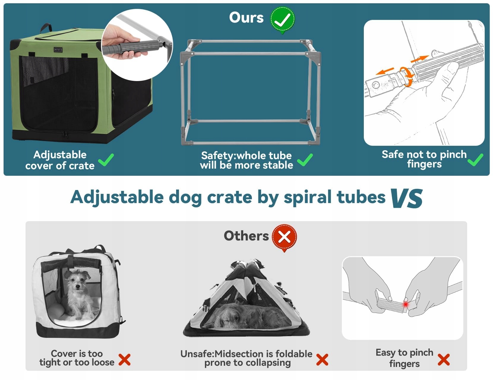 Ten transporter dla psów średniej wielkości jest zaprojektowany jako stabilna całość, bez składanych części w środku, aby zapewnić stabilność strukturalną i zapobiec zapadaniu się lub przyciśnięciu psa. Dzięki temu psy mogą w nim stać, leżeć i opierać się o wewnętrzne stalowe rurki.