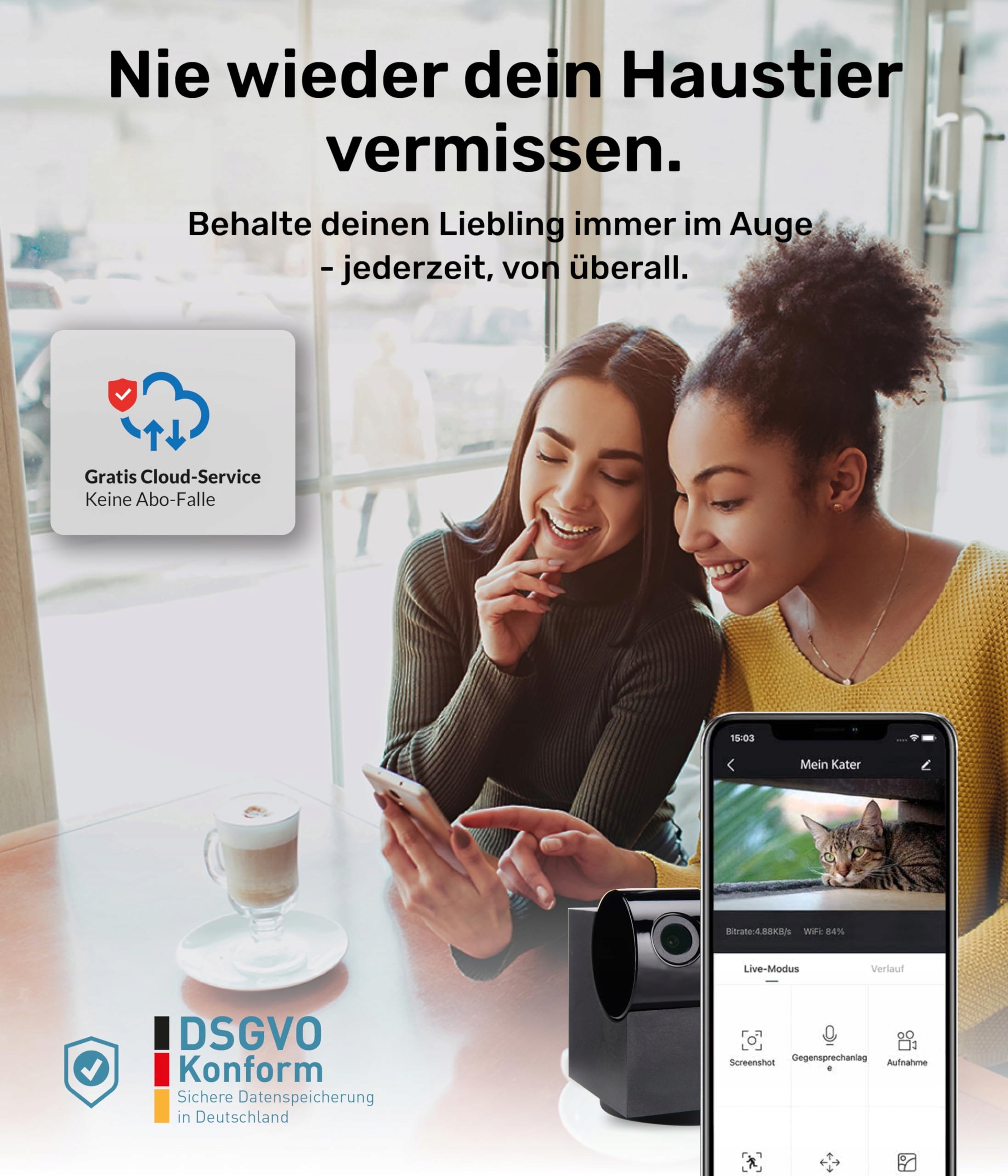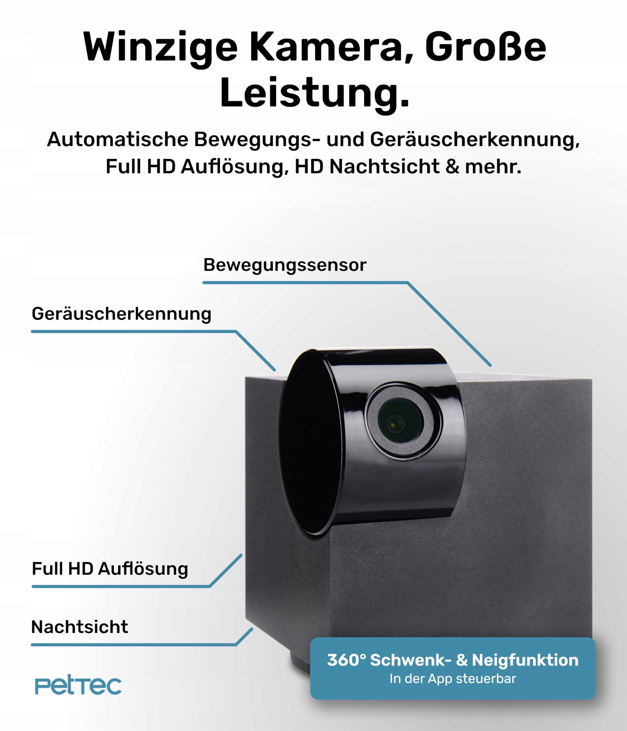 𝗖𝗟𝗢𝗨𝗗 𝗕𝗘𝗭 𝗣𝗨Ł𝗔𝗣𝗞𝗜 𝗔𝗕𝗢𝗡𝗔𝗠𝗘𝗡𝗧𝗢𝗪𝗘𝗝: PetTec Cam 360° pomaga Ci zawsze mieć oko na swojego pupila - wystarczy jedno spojrzenie na darmową i wolną od reklam aplikację (IOS & Android). Kamera dla zwierząt z możliwością obrotu o 360° jest oparta na WiFi i działa w sieci 2,4 / 5 GHz.