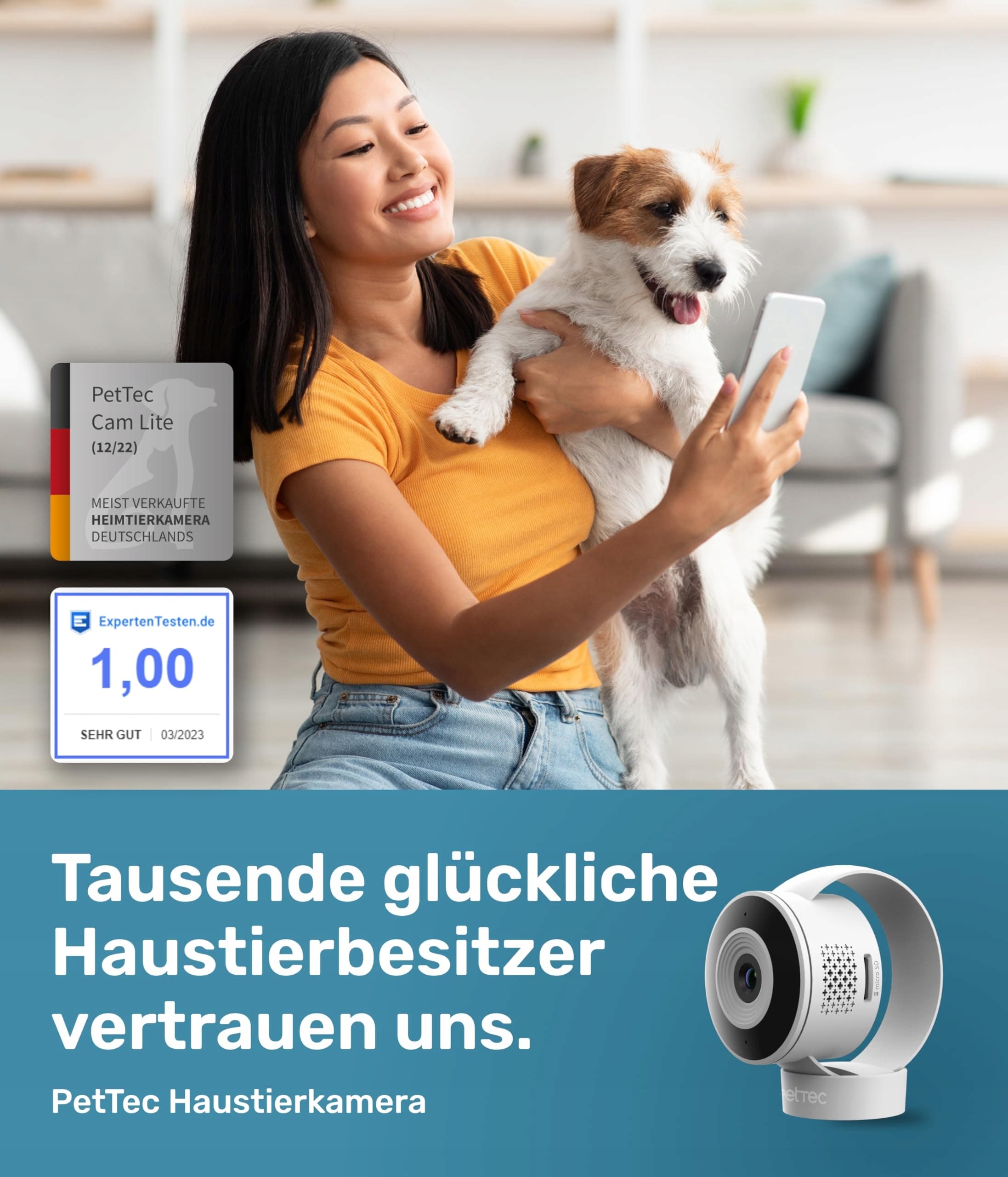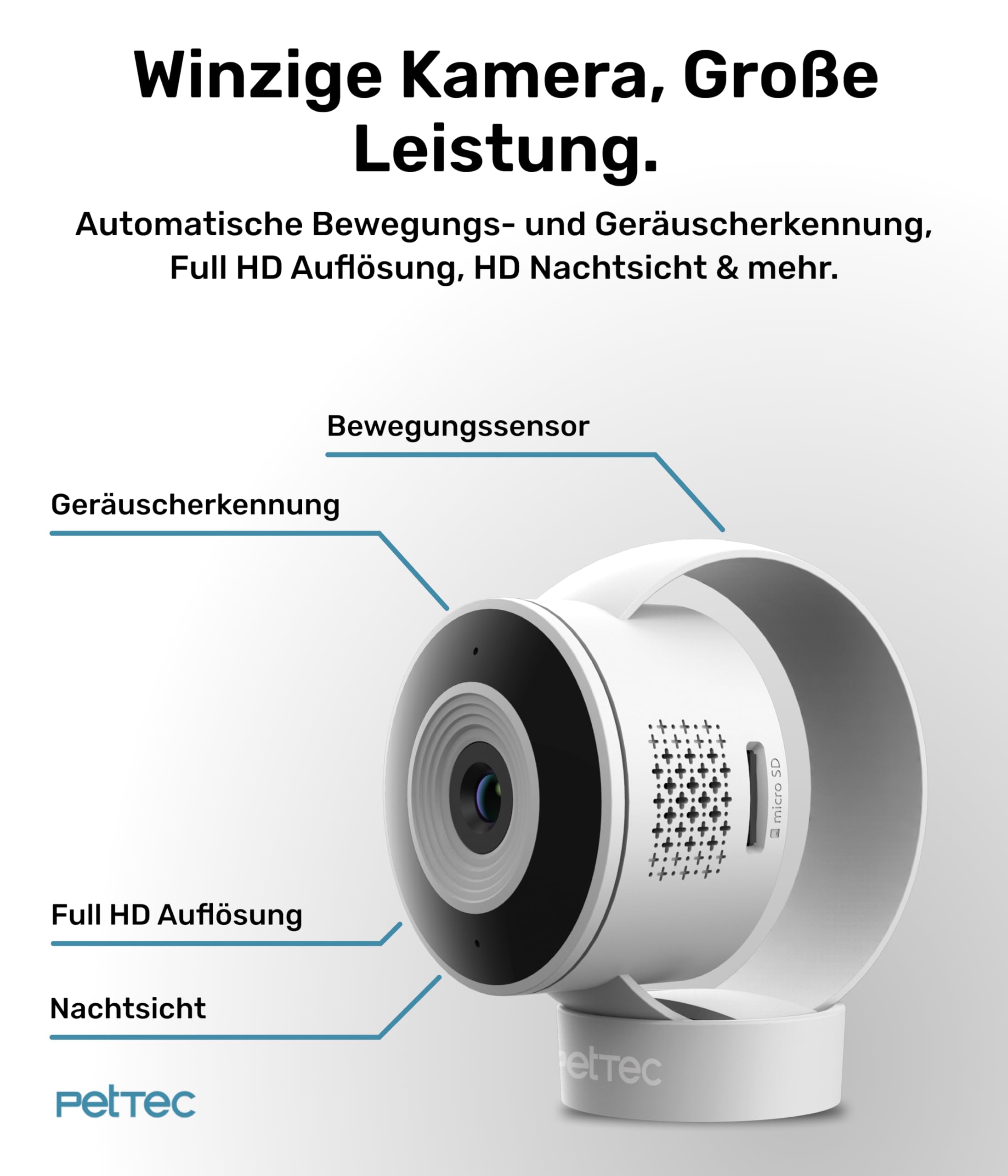 PetTec® Cam Lite - 3MP kamera dla zwierząt domowych kamera dla psa z aplikacją [BEZ PUŁAPKI ABONAMENTOWEJ] - kamera dla kotów i psów w domu z wykrywaniem ruchu i funkcją noktowizji - kamera dla zwierząt z wykrywaniem dźwięku i funkcją głosową