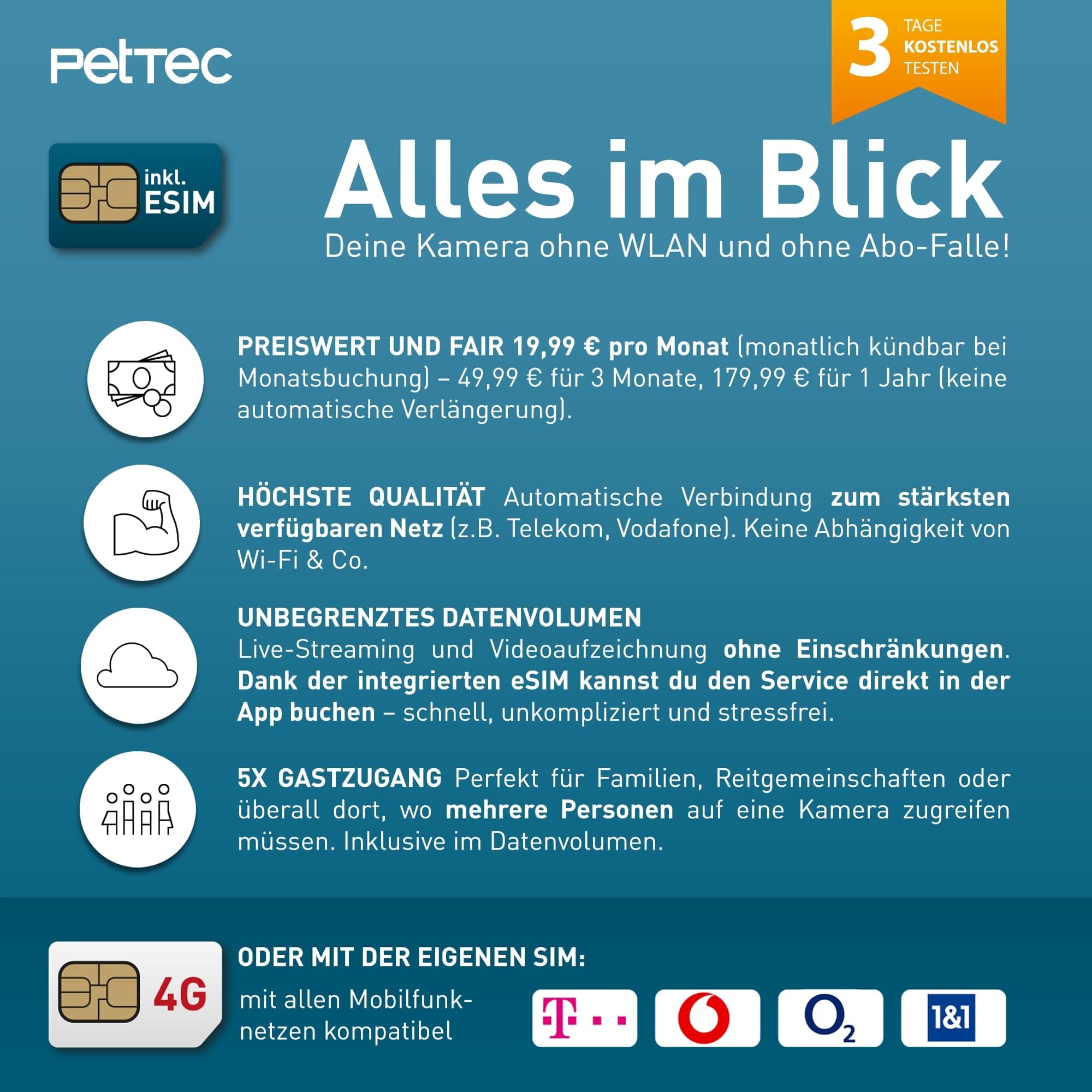 TECHNOLOGIA 4G/LTE: Brak Wi-Fi? Żaden problem! – Używa albo PetTec 4G/LTE E-Sim, albo własnej fizycznej karty SIM 4G/LTE. Doświadcz niezawodnej transmisji danych w wysokiej prędkości, idealnej dla odległych lokalizacji bez Wi-Fi
