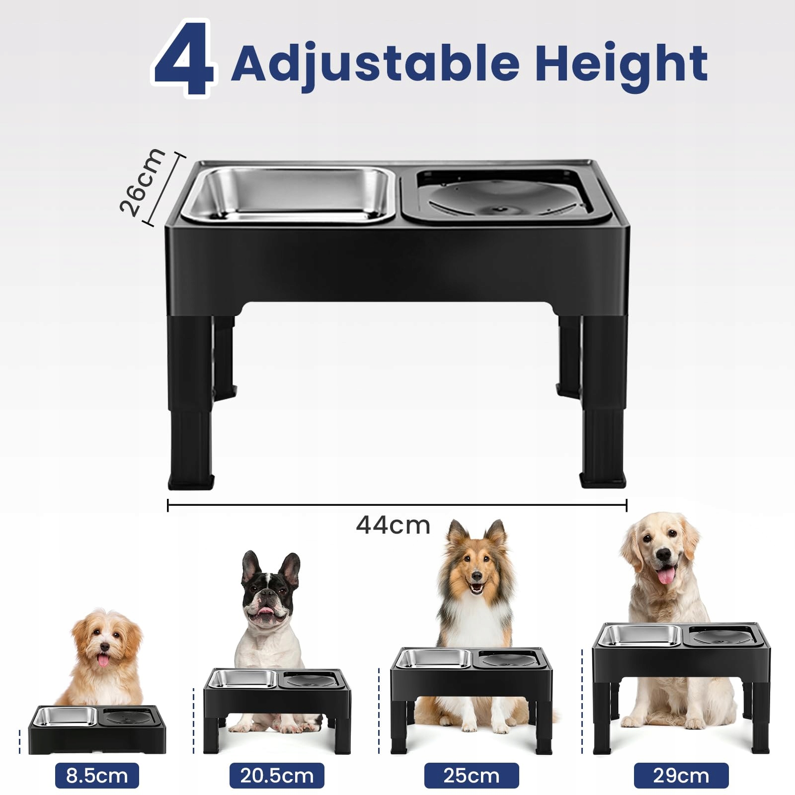 [INDYWIDUALNIE DOPASOWANE WYSOKOŚCI]Nasza wysokiej jakości miska na karmę i wodę dla psa oferuje cztery regulowane wysokości: 8,5 cm, 20,5 cm, 25 cm i 29 cm. Te wysokości idealnie odpowiadają potrzebom psów w różnych stadiach wzrostu i rozmiarach, od małych szczeniąt po duże psy.