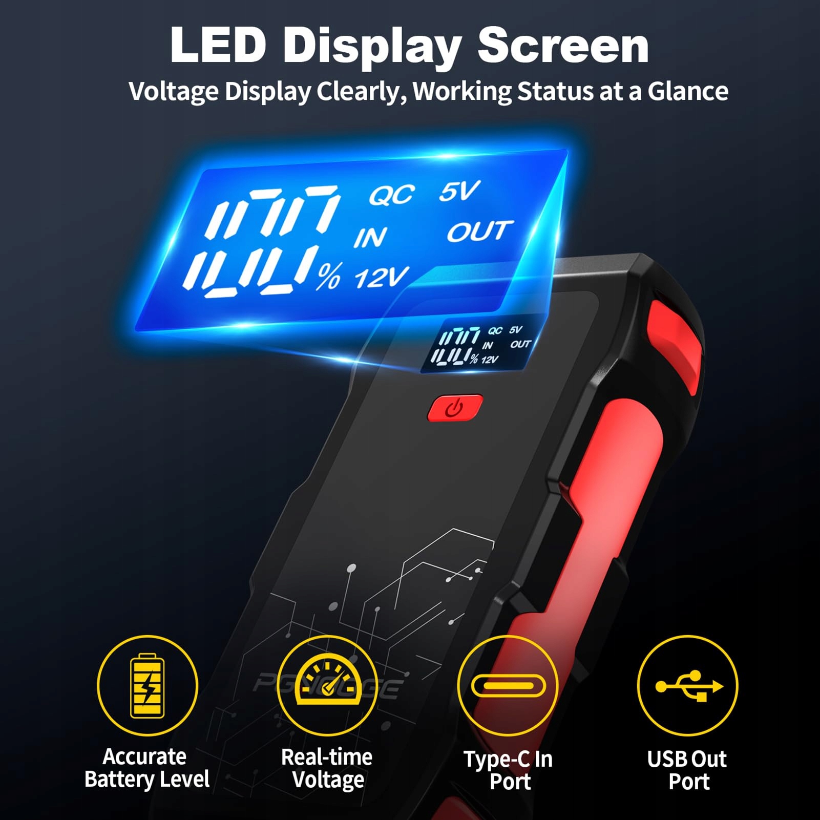 【WYŚWIETLACZ LED】Powerbank PGNOOGE Starthilfe posiada wyświetlacz LED, który pokazuje stan baterii i aktualne napięcie. Nawet w ciemności jego użytkowanie jest bezproblemowe! Idealny w podróży, niezawodne urządzenie do rozruchu akumulatora samochodowego na każdą awaryjną sytuację