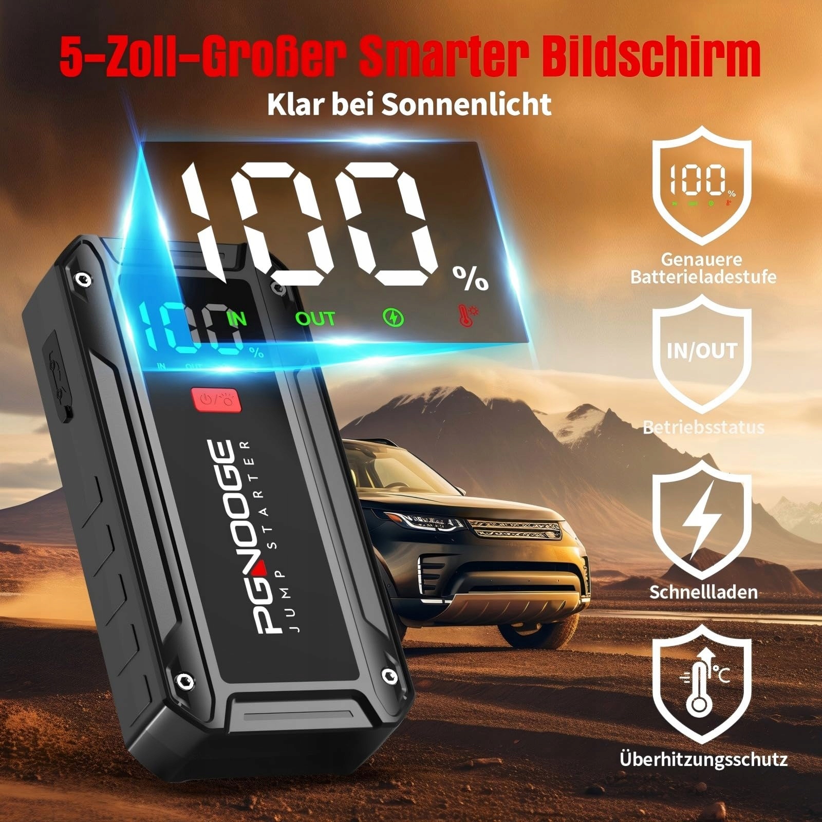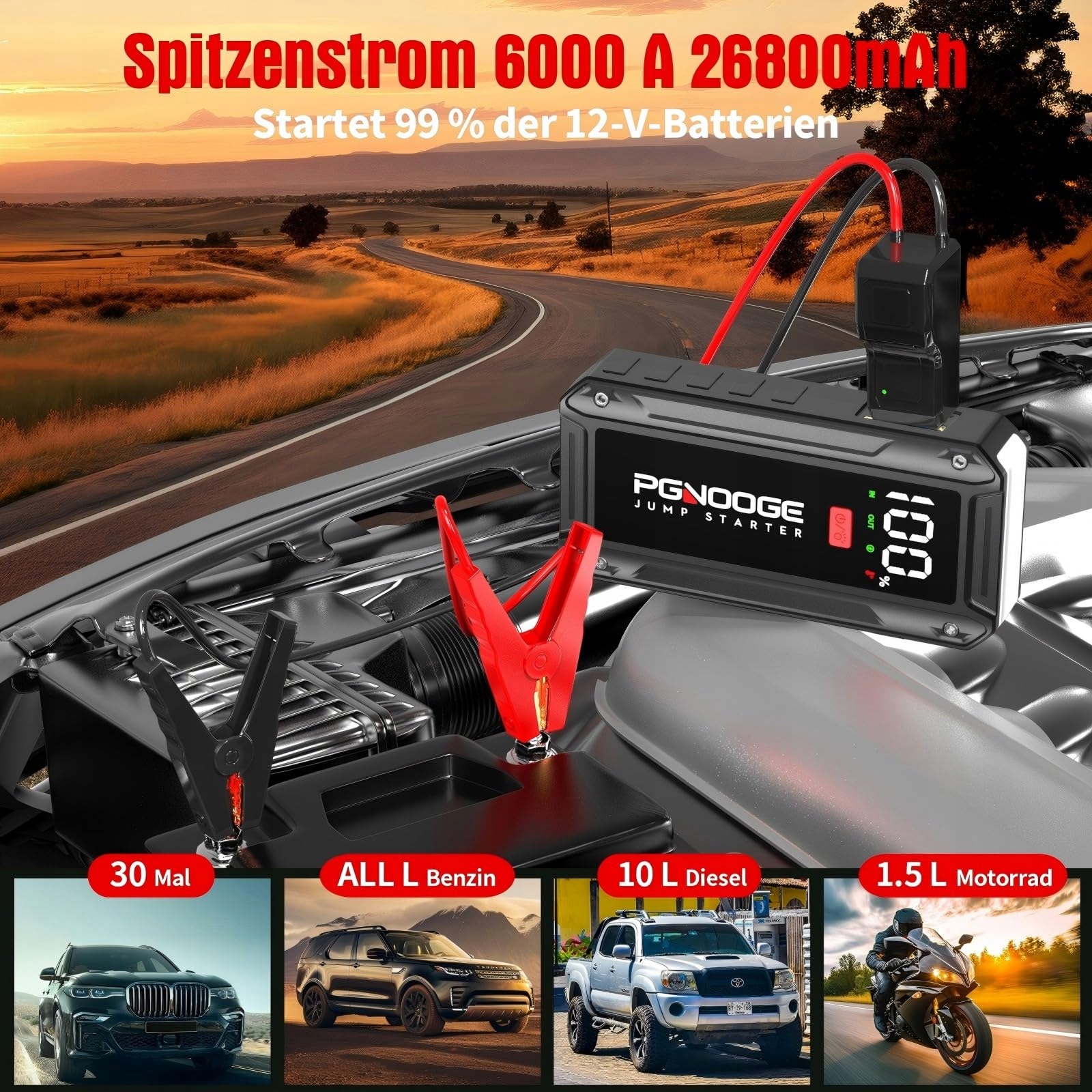 PGNOOGE Powerbank rozruchowa 26800mAh 6000A (do wszystkich silników benzynowych, 10 L diesla) Rozruch samochodowy z latarką LED, dużym ekranem, ekranem jumper, boosterem akumulatora samochodowego do SUV, motocykla, kosiarki