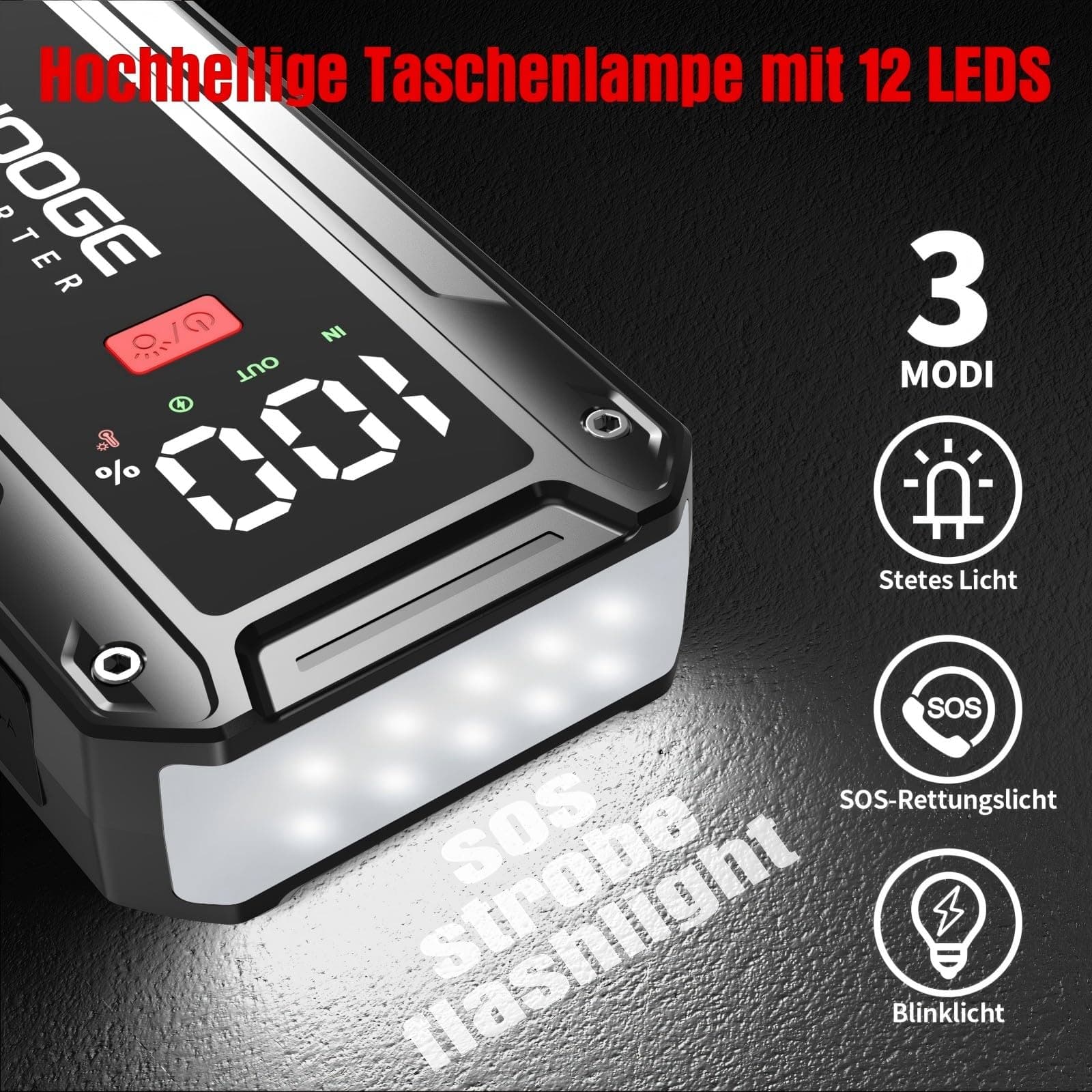 Wielofunkcyjny i bezpieczny: Latarka składa się z 12 diod LED, o ultra wysokiej jasności 600 lumenów i 3 trybach: oświetlenie, stroboskop i SOS. Możesz jej używać podczas kempingu, na zewnątrz, w nagłych wypadkach, w podróży itp. Powerbank rozruchowy do akumulatora samochodowego posiada inteligentny system ochrony, który chroni przed zwarciem, bez obaw o błędne podłączenia lub iskrzenie. Oferuje ochronę przed przeciążeniem prądowym, przeciążeniem, przepięciami, przeładowaniem, przegrzaniem itd. Łatwy w obsłudze, bezpieczny dla każdego użytkownika.