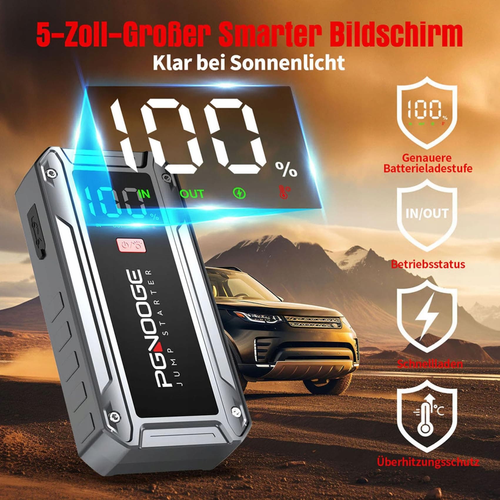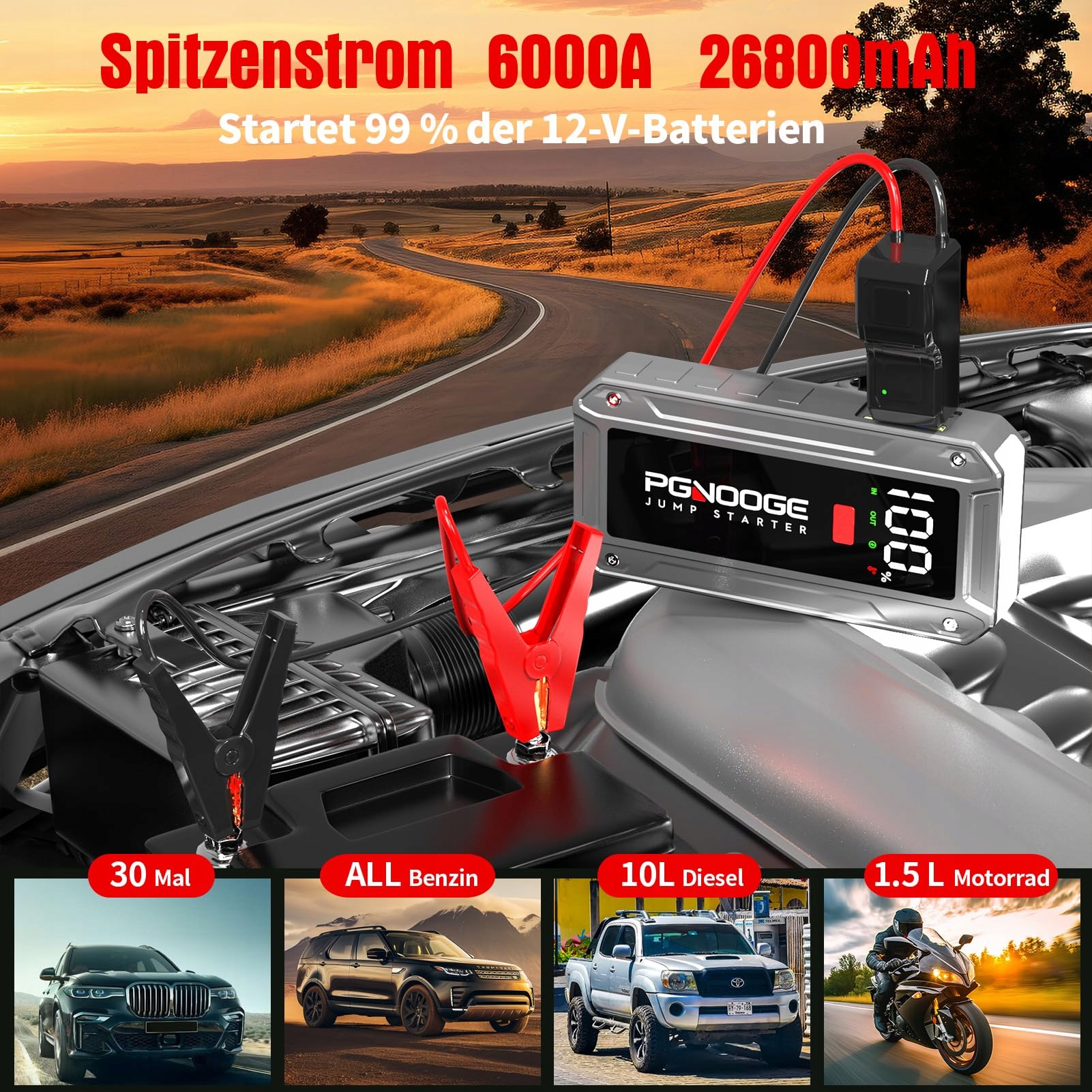 PGNOOGE Powerbank rozruchowa 6000A 26800mAh (do wszystkich benzyn, 10 L diesla) Rozruch samochodu z latarką LED, dużym ekranem, ekranem jumpera, boosterem akumulatora samochodowego do SUV, motocykla, kosiarki