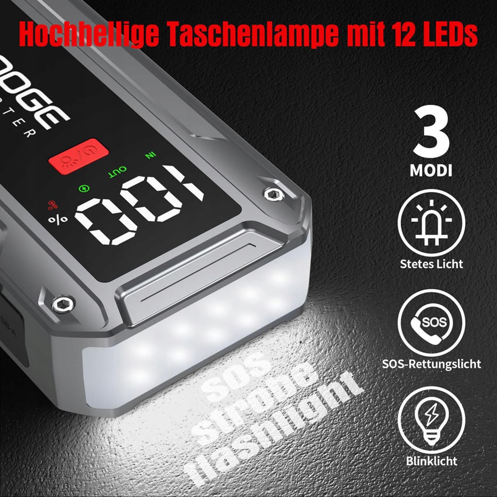 Duży wyświetlacz: Powerpack rozruchowy samochodu 12V z dużym wyświetlaczem 5 cm*3,5 cm wyraźnie pokazuje ważne informacje. Należą do nich wewnętrzny poziom baterii rozruchowej, stan ładowania, status dostarczanej mocy, monitorowanie temperatury baterii oraz status kabla rozruchowego. Ten projekt ułatwia i upraszcza korzystanie z urządzenia rozruchowego.
