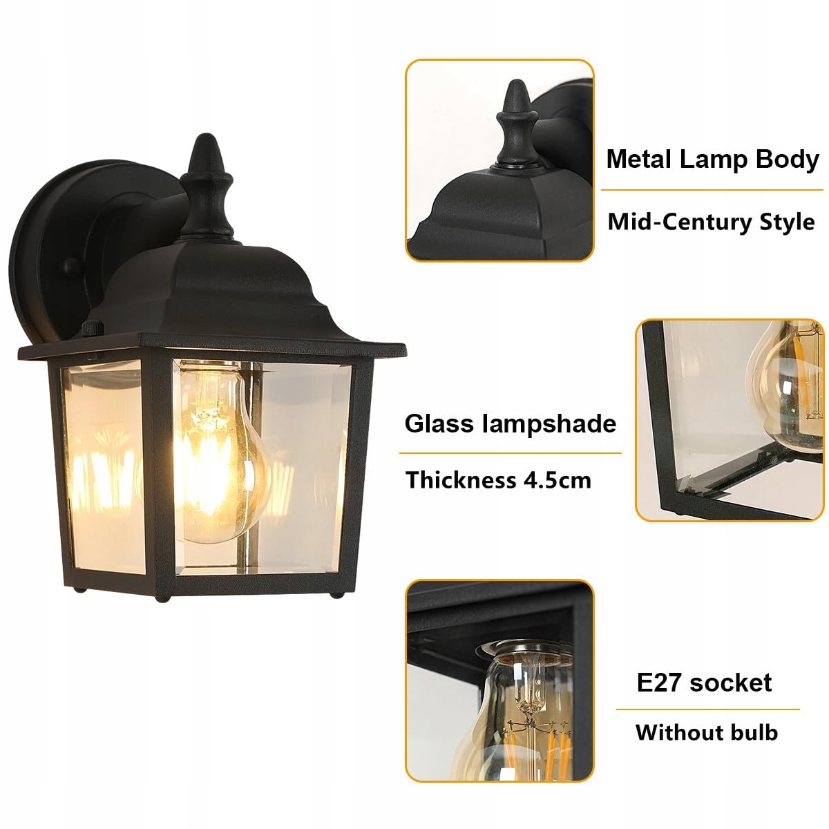 Wysoka jakość: Obudowa lampy Pheashine zewnętrznej E27 wykonana jest z wysokiej jakości odlewu aluminiowego, a równomierna powłoka natryskowa na powierzchni zapobiega rdzewieniu produktu. Klosz szklany zapewnia maksymalną jasność.