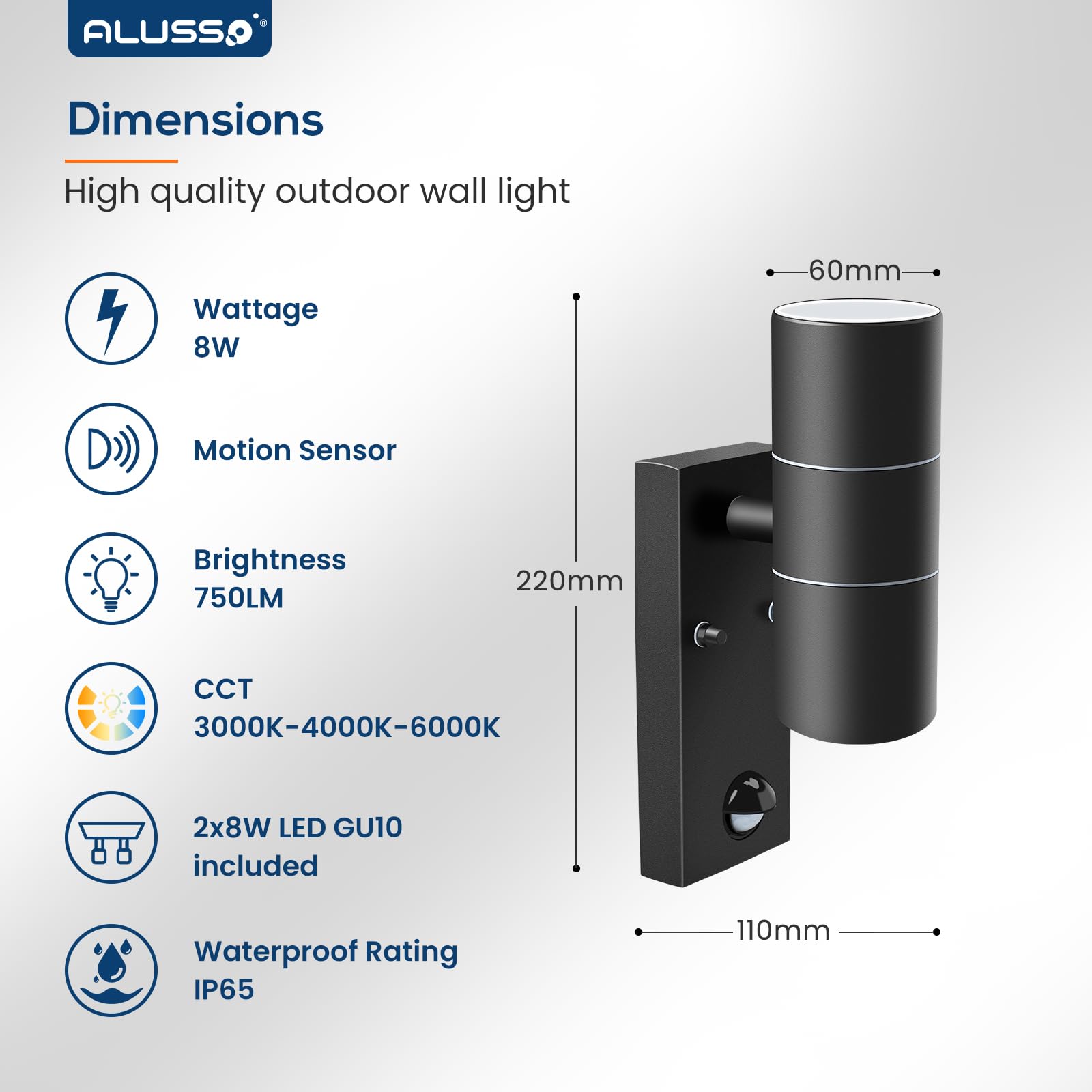 Zewnętrzna lampa ścienna z czujnikiem ruchu, lampa góra-dół z czujnikiem PIR, stal nierdzewna IP65 wodoodporne czarne zewnętrzne światło bezpieczeństwa, 2x8 W żarówki LED GU10 w zestawie, 3 temperatury barwowe przełączalne