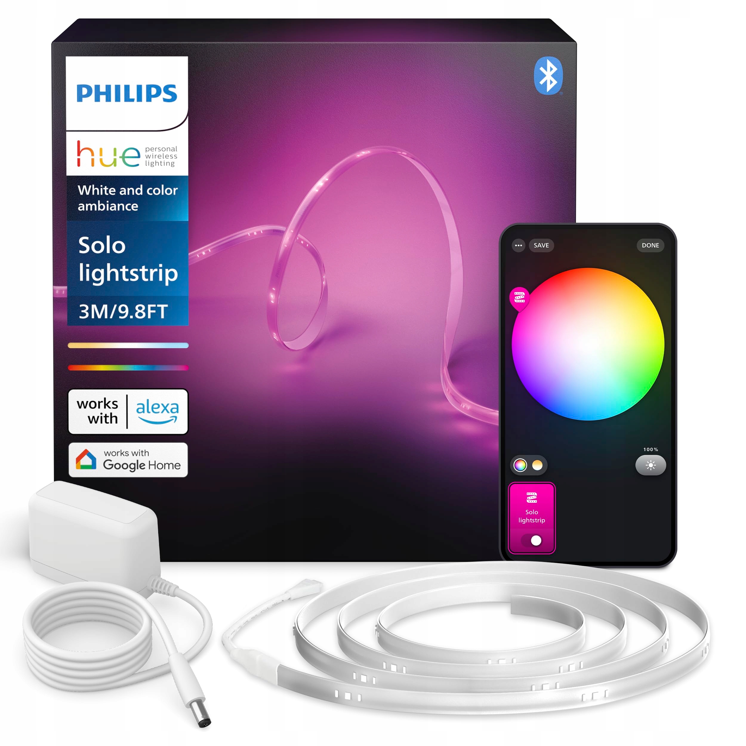 Philips Hue Indoor 3m Smart LED Solo Lightstrip Zestaw Podstawowy, 1 sztuka, Sterowanie za pomocą aplikacji Hue, Działa z Alexa, Asystentem Google i Apple HomeKit