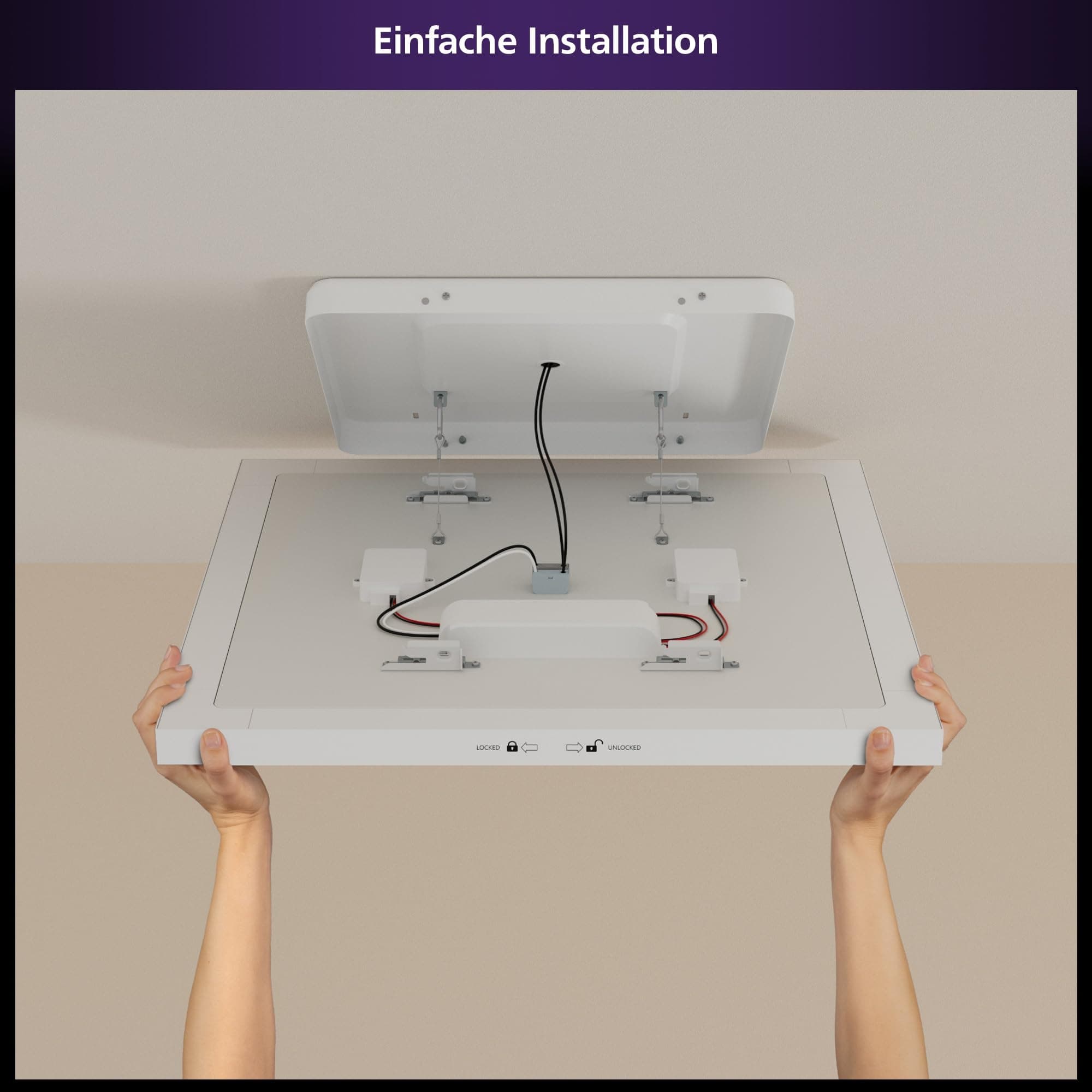Łatwy w instalacji: Wystarczy zamontować podstawę i zawiesić panel sufitowy Hue na dołączonych hakach, aby podłączyć go do sieci elektrycznej domu; następnie panel po prostu się zatrzaskuje