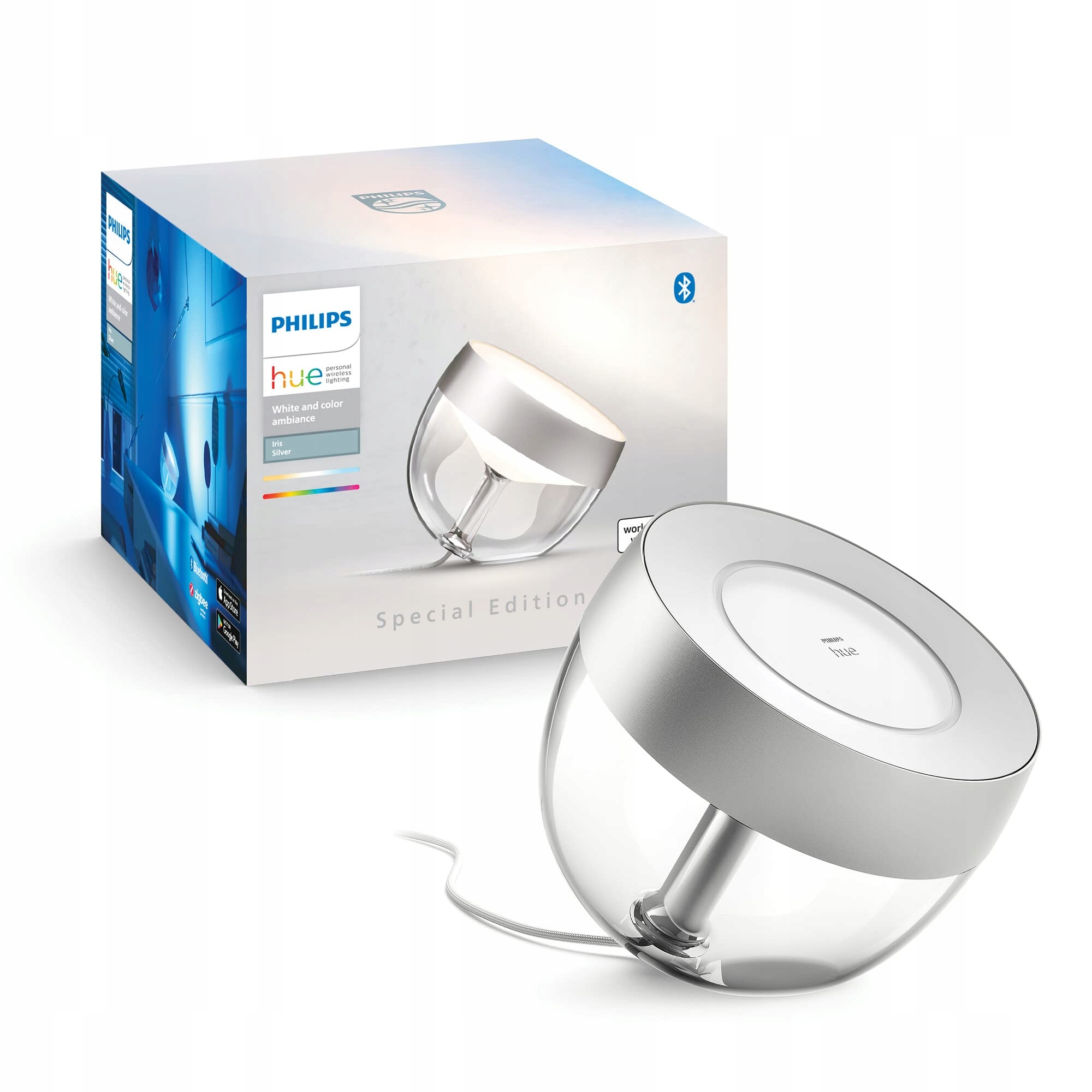 Philips Hue White & Color Ambiance Iris Tischleuchte Special Edition Silber 520lm, ściemnialna, 16 mln kolorów, sterowalna przez aplikację, kompatybilna z Amazon Alexa (Echo, Echo Dot)